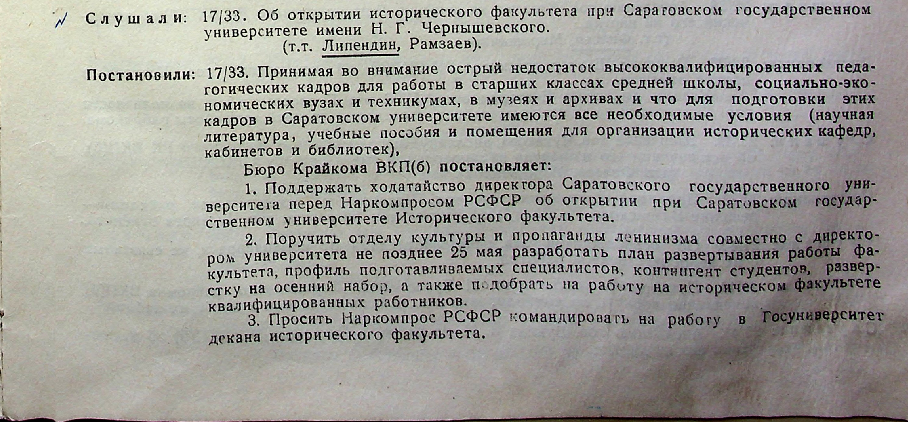 Постановление бюро Саратовского крайкома ВКП(б) о ходатайстве перед Наркоматом просвещения РСФСР об открытии исторического факультета при Саратовском государственном университете имени Н.Г. Чернышевского (протокол от 13 мая 1935 г. № 68).