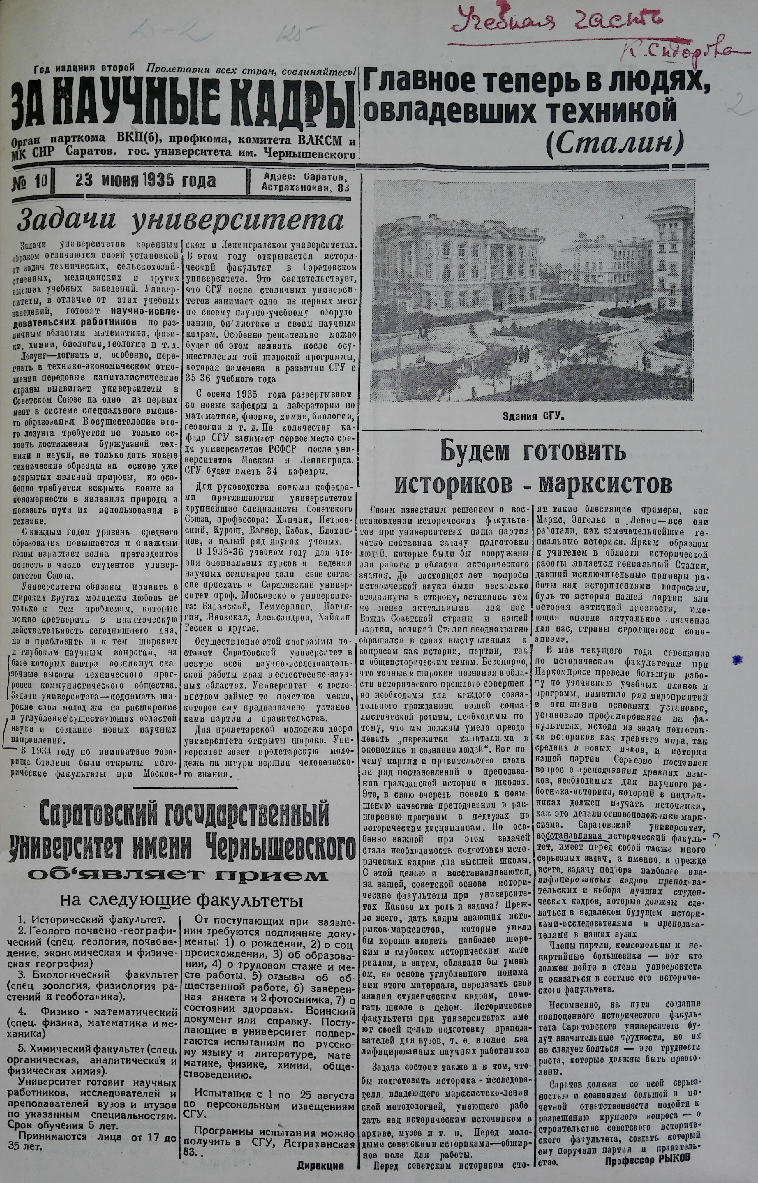 Заметка профессора П.С. Рыкова «Будем готовить историков-марксистов» о задачах, стоящих перед историческими факультетами.