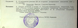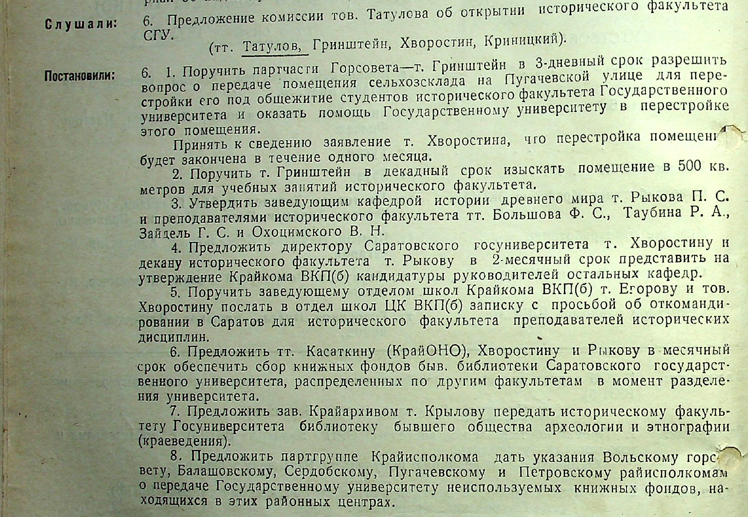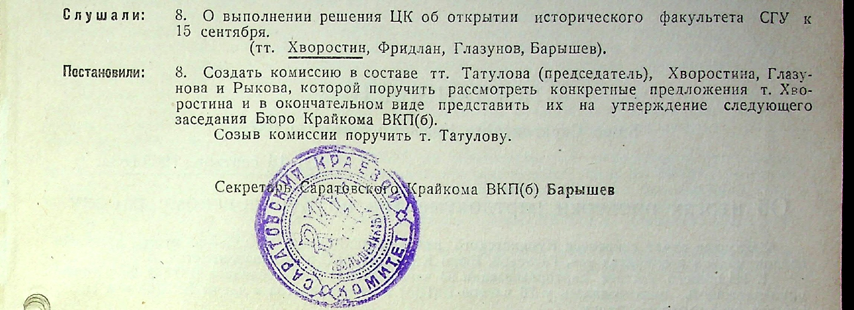 Постановление бюро Саратовского крайкома ВКП(б) «Предложение комиссии т. Татулова об открытии исторического факультета СГУ» (протокол от 5 октября 1935 г. № 100).