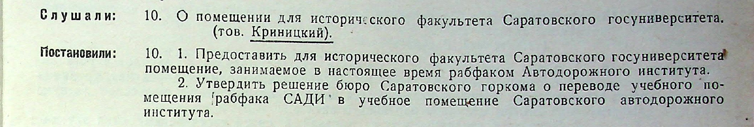 Постановление бюро Саратовского крайкома ВКП(б) «О помещении для исторического факультета Саратовского госуниверситета» (протокол 31 октября 1935 г. № 114).