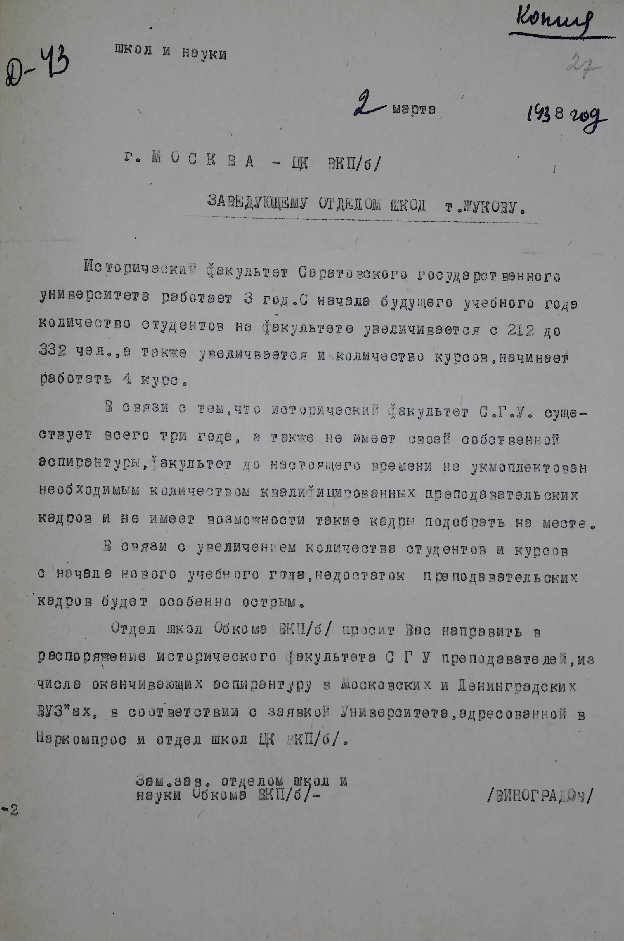 Сообщение заместителя заведующего отделом школ и науки Саратовского обкома ВКП(б) И.Т. Виноградова в отдел школ ЦК ВКП(б) с просьбой о выделении преподавательских кадров из числа окончивших аспирантуру в вузах Москвы и Ленинграда.