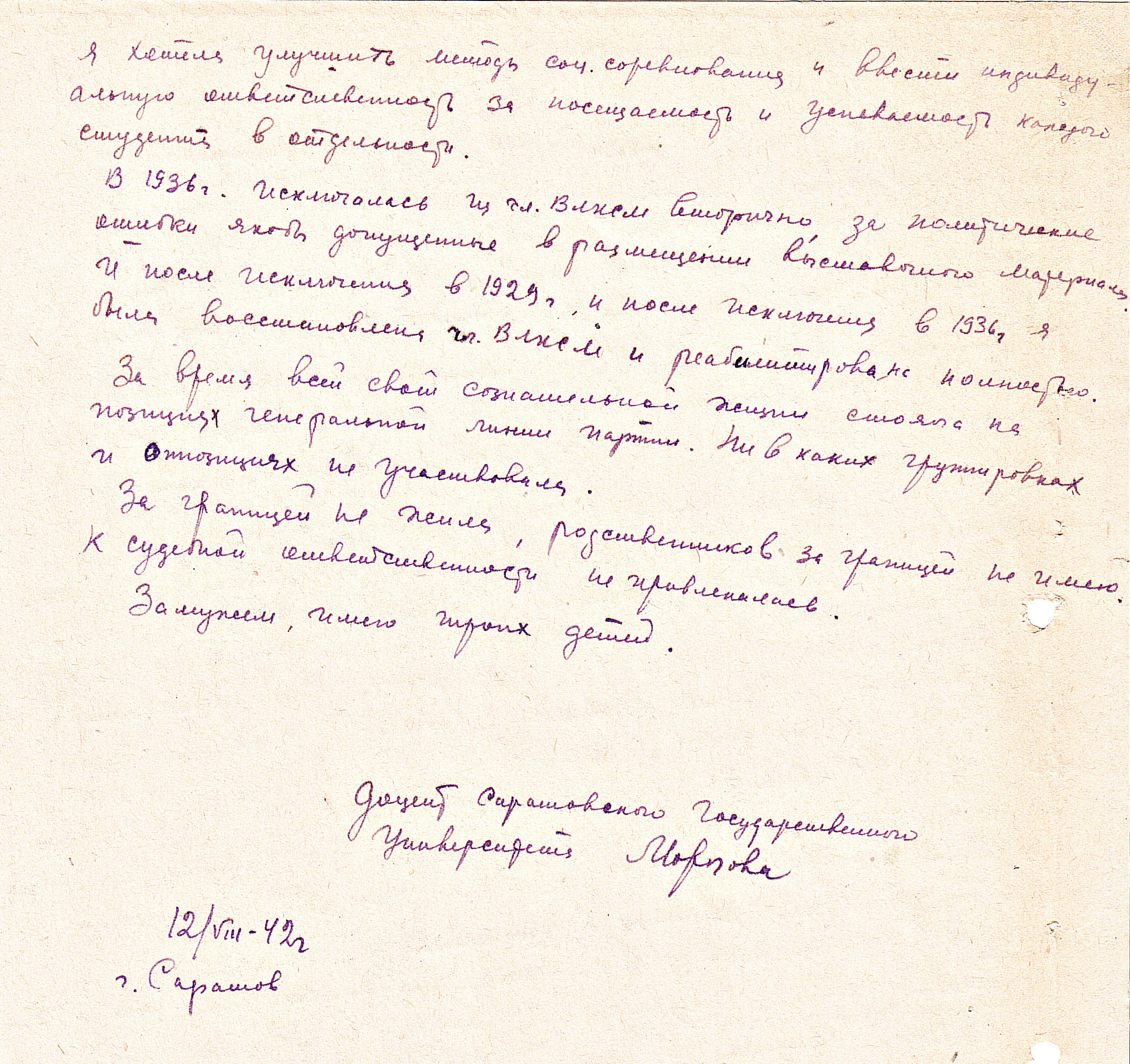 Автобиография Морозовой Тамары Лукиничны (из личного дела работника, состоящего на номенклатурном учёте обкома партии).