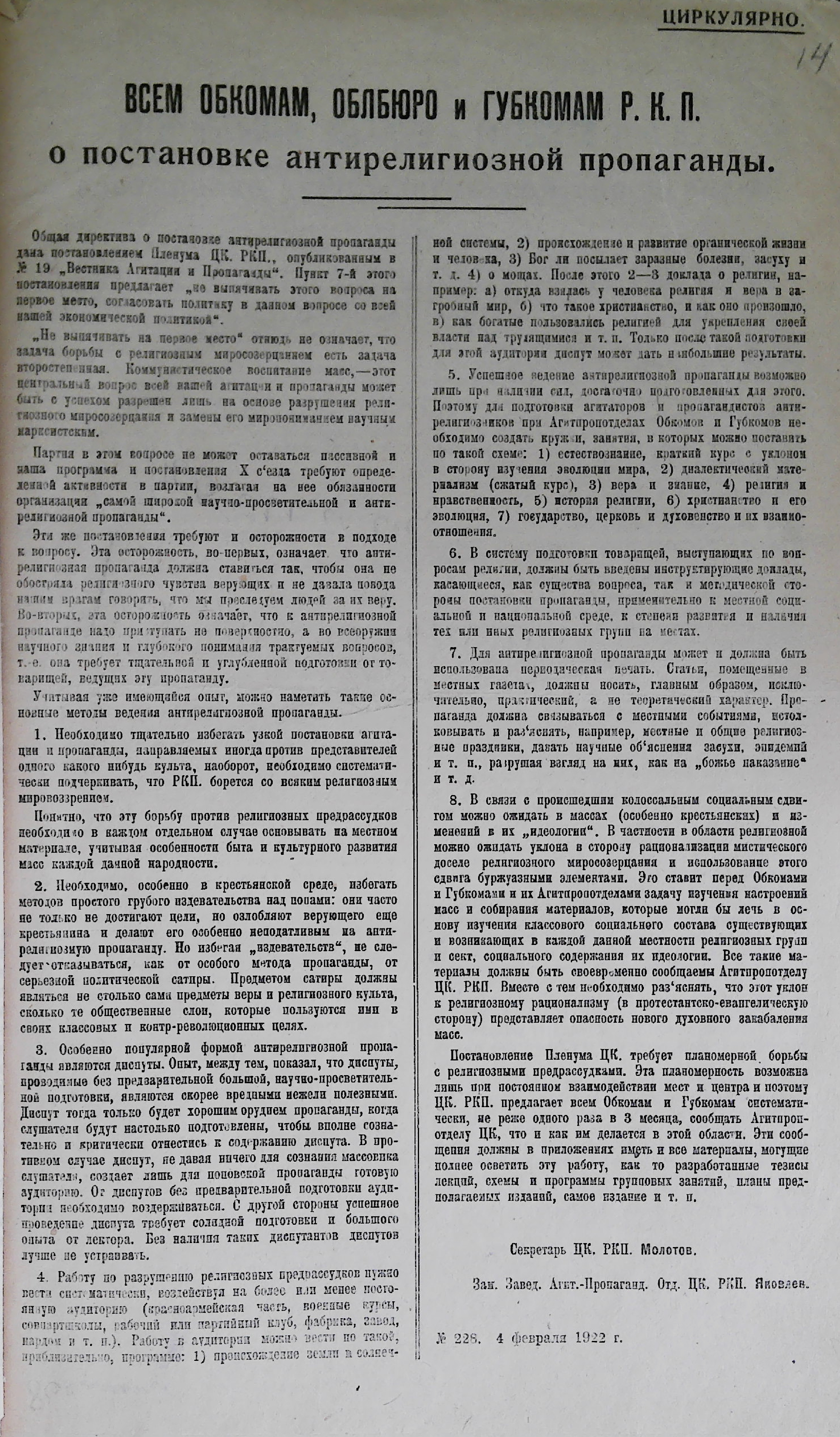 В начале 1922 вышла в свет общая директива секретаря ЦК РКП(б) В.М. Молотова о постановке антирелигиозной пропаганды и о ее методах. На ее основе разработали циркуляр «О постановке антирелигиозной пропаганды». Основной акцент в документе сделан на усилении антирелигиозной кампании. В циркулярном письме декларировался довольно осторожный подход к религиозной проблеме.