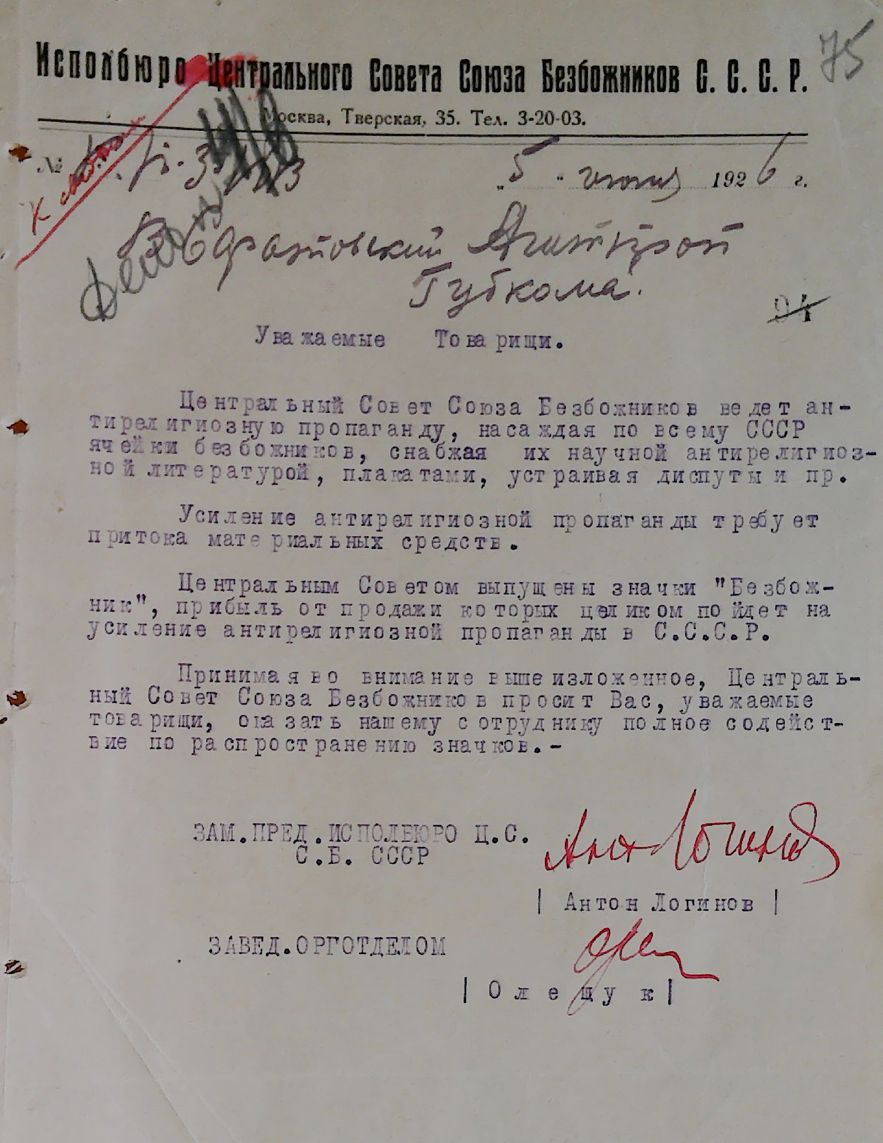 Письмо руководства Союза безбожников в Саратовский губком ВКП(б) с просьбой об оказании финансовой помощи Союзу путем приобретения значков «Безбожник».