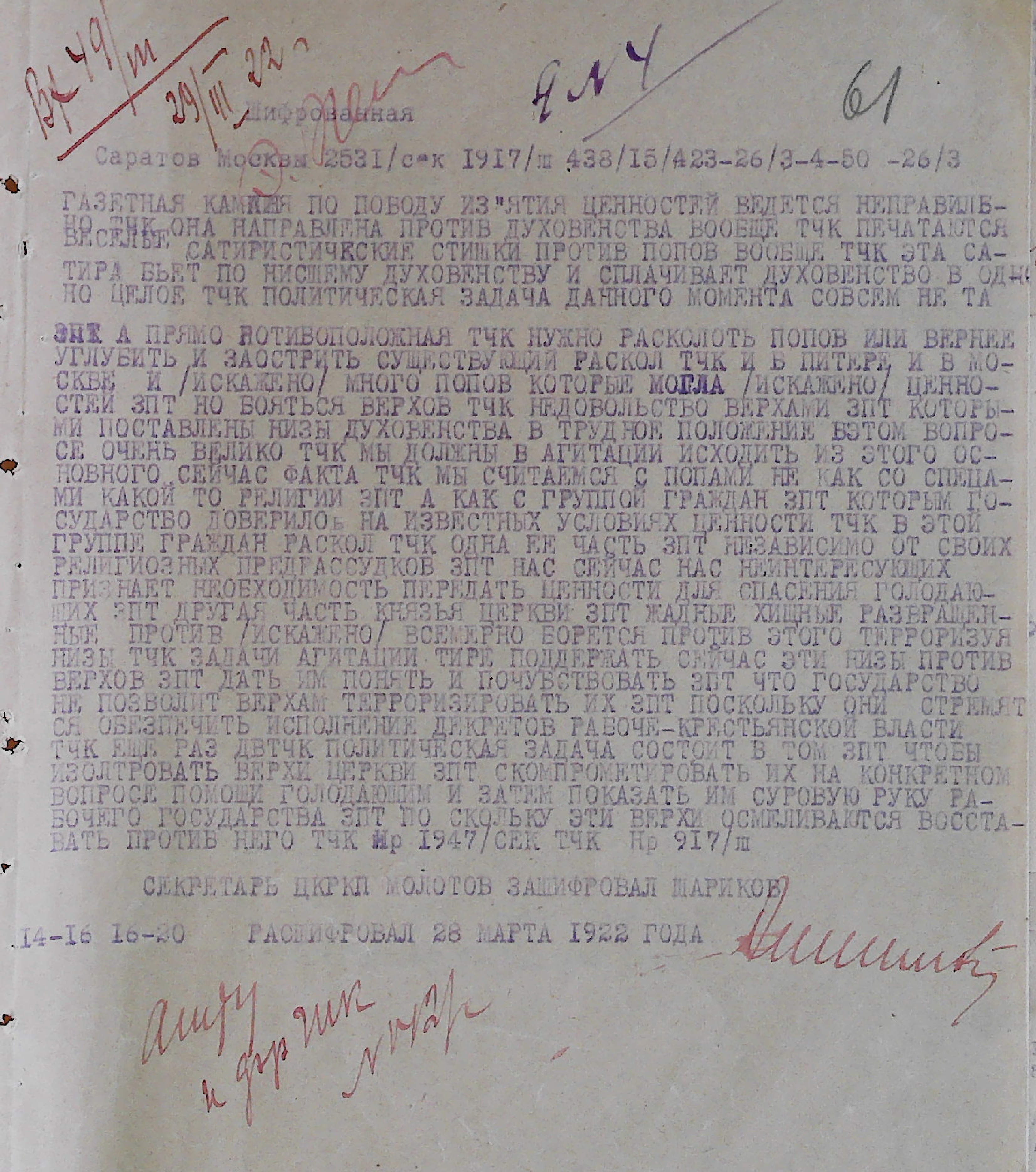 Шифрованная телеграмма секретаря ЦК РКП(б) В.М. Молотова о политической задаче раскола групп духовенства по вопросу изъятия церковных ценностей.