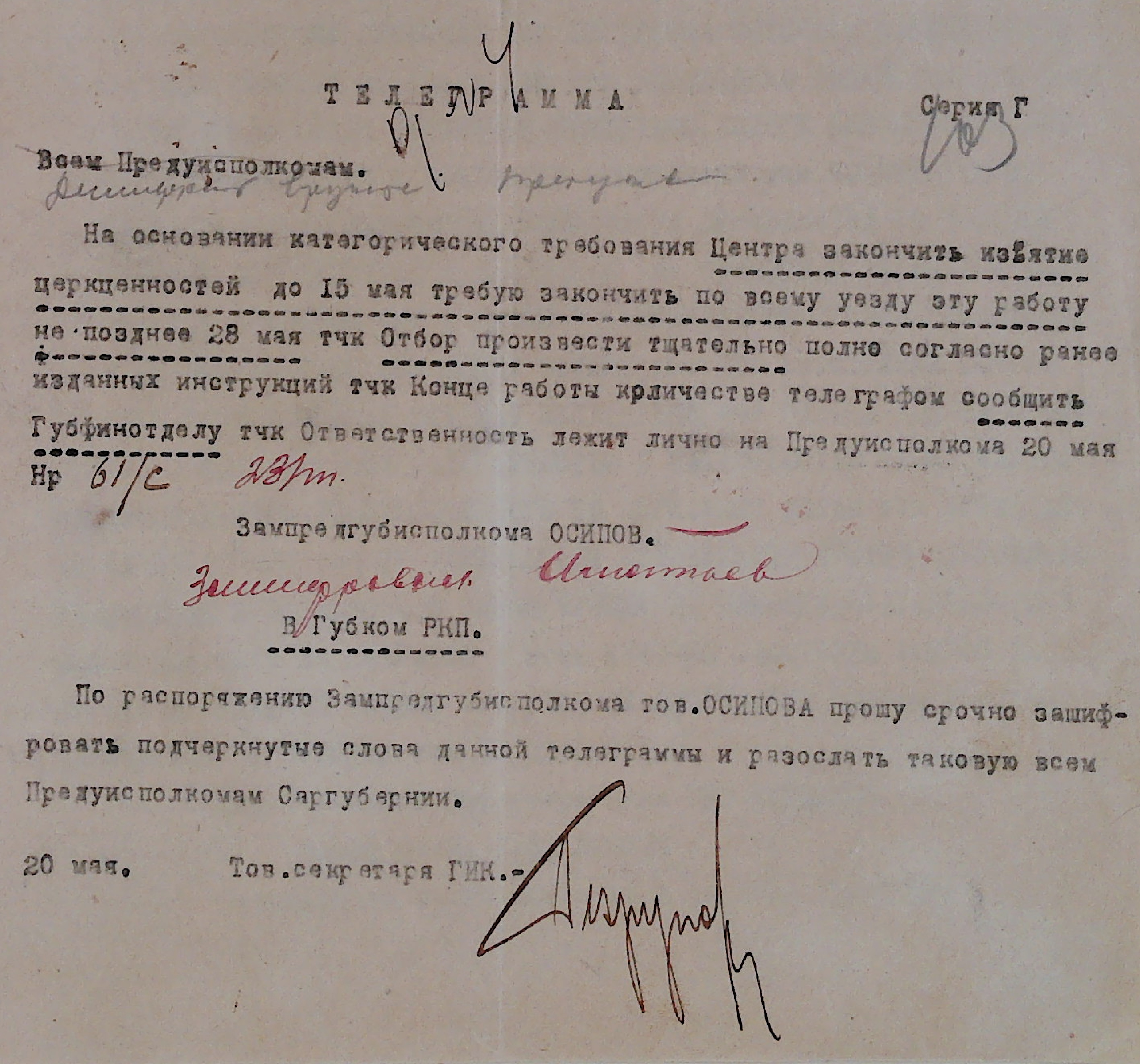 Телеграмма заместителя председателя губернского исполнительного комитета А. Осипова с требованием об окончании изъятия церковных ценностей до 28 мая 1922 г.