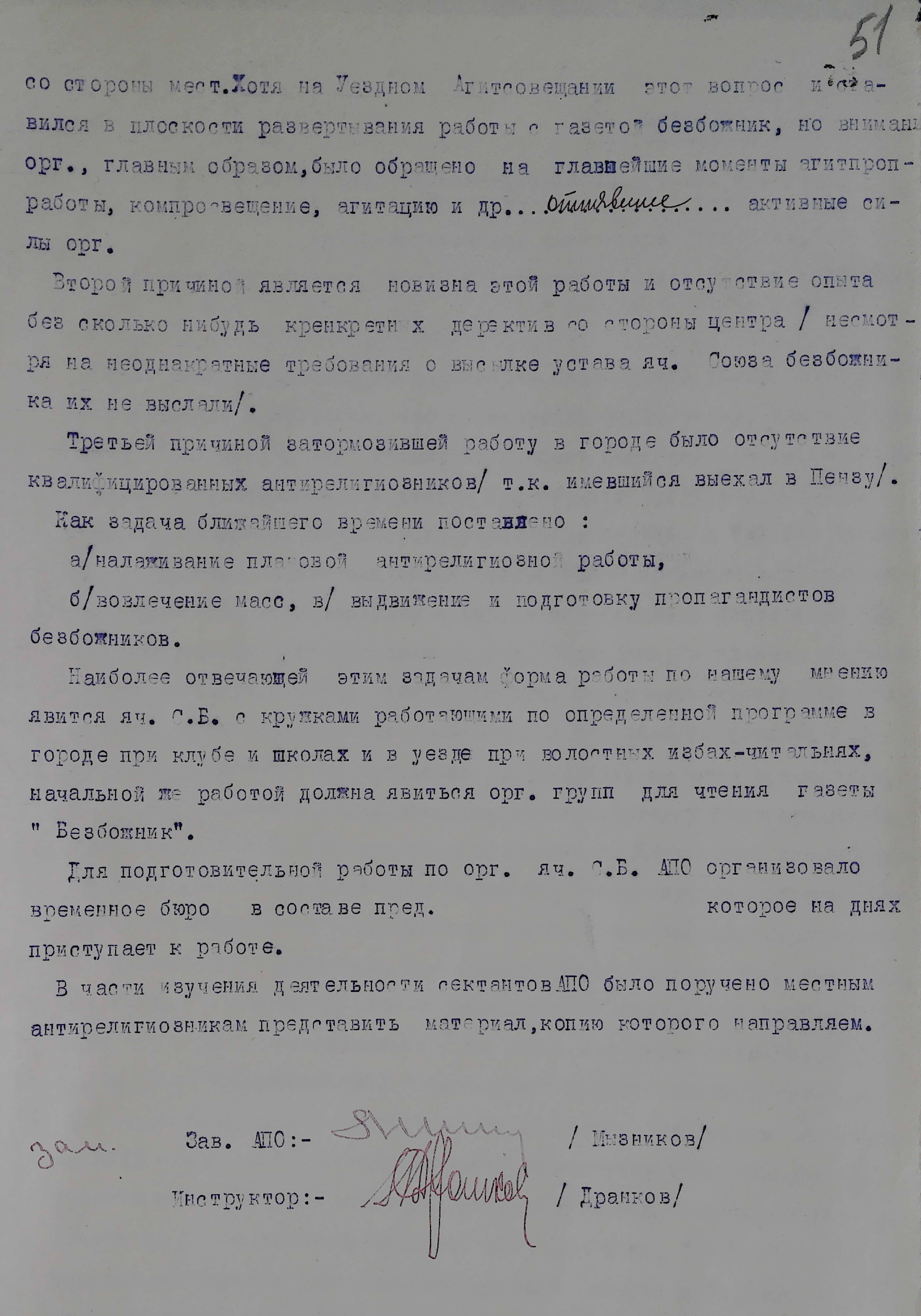 Документ свидетельствует о недостатках в работе Союза безбожников, а также о сопротивлении населения антирелигиозной политике.