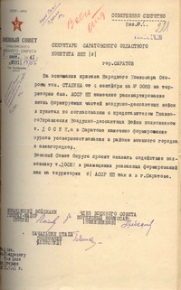 Сообщение командования Приволжского военного округа в Саратовский обком ВКП(б) об оказании содействия формируемым в области частям ВДВ