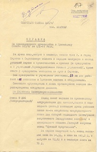 Докладная записка начальника переселенческого отдела Саратовского облисполкома М.И. Матвеева секретарю Саратовского обкома ВКП(б) И.А. Власову о количестве, трудоустройстве и бытовых нуждах эвакуированного населения, размещённого в области