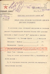 Сообщение командования Приволжского военного округа в Саратовский обком ВКП(б) о необходимости строительства в области 11 аэродромов по указанию ГКО