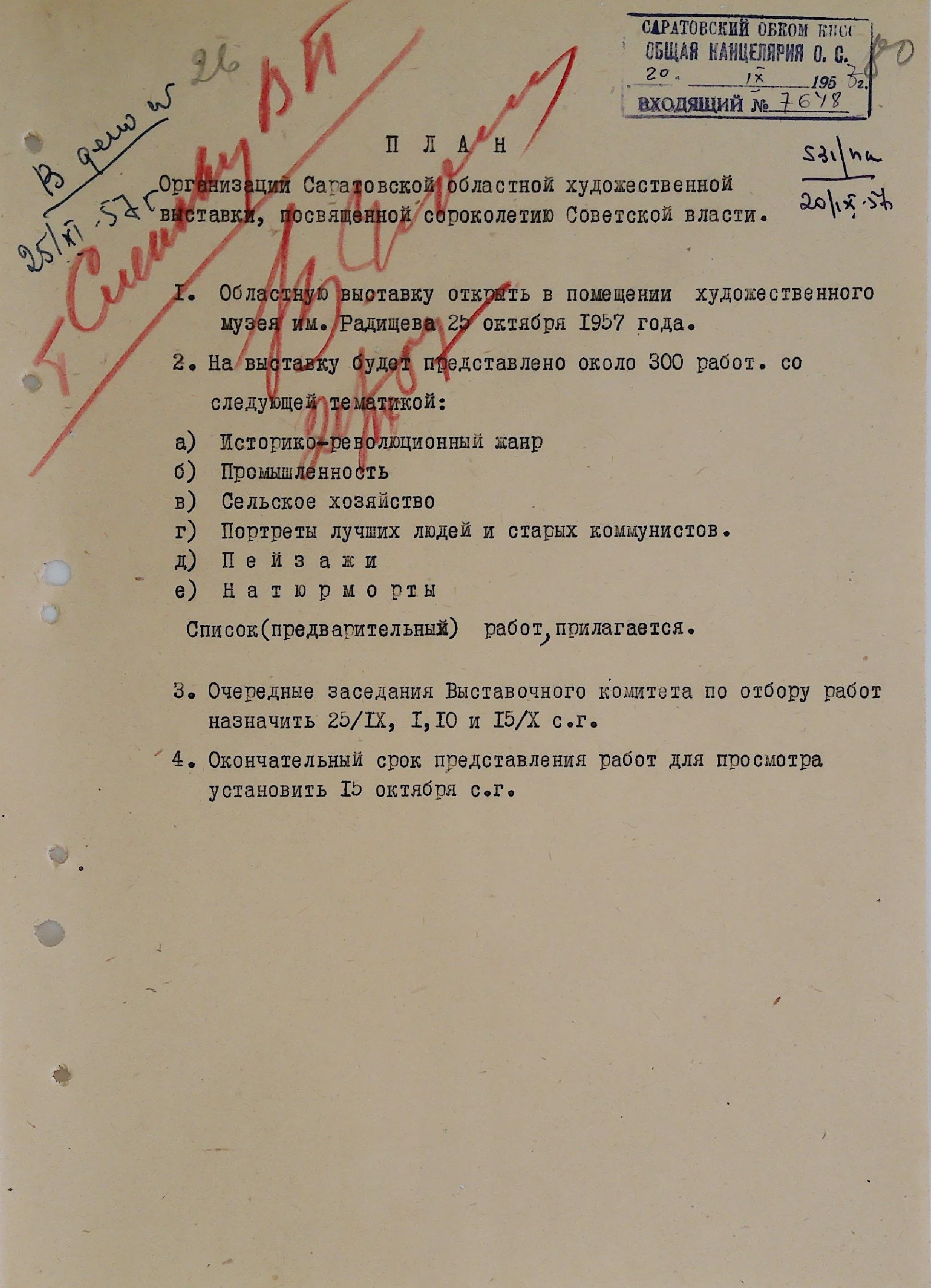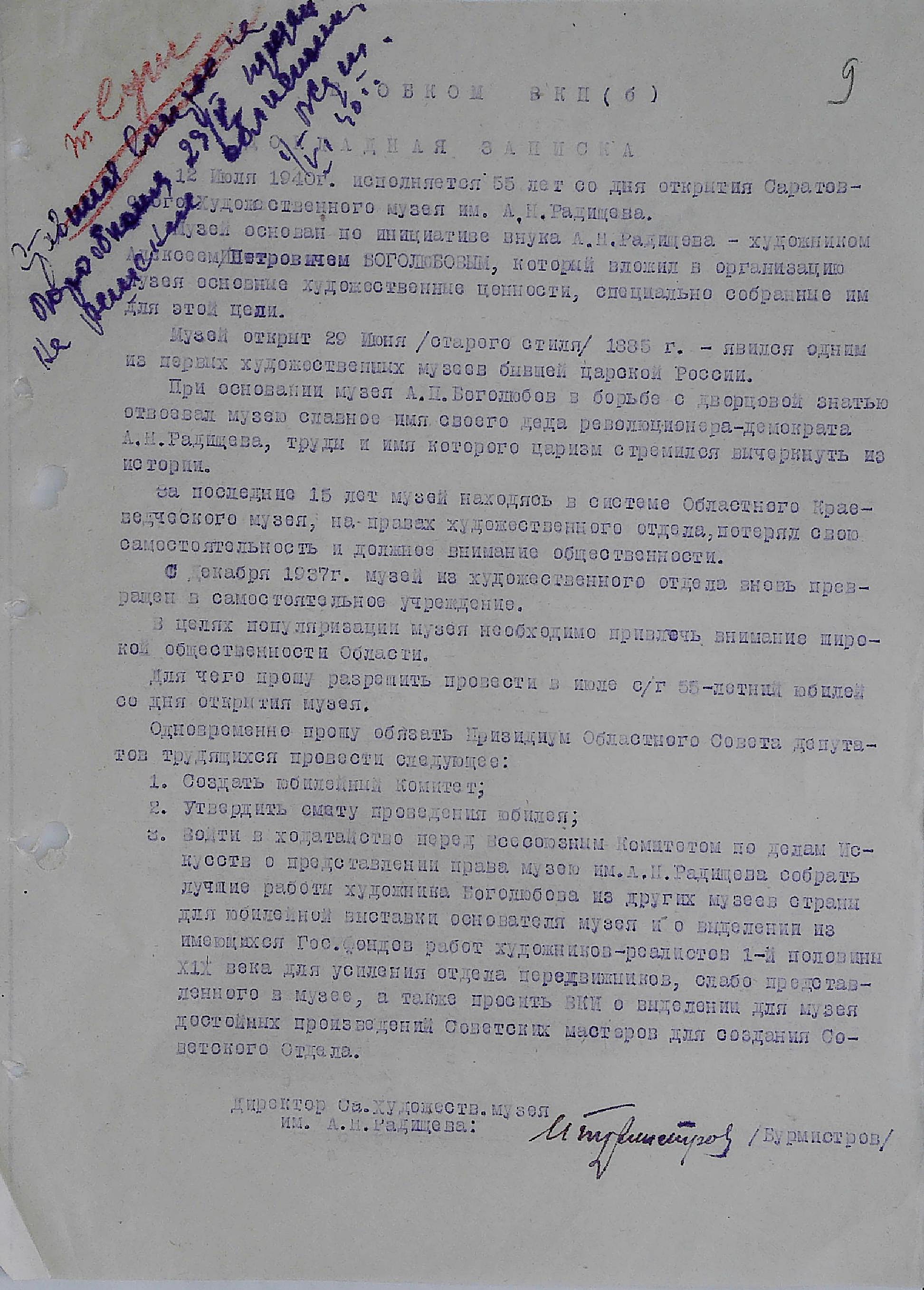 Докладная записка директора Саратовского художественного музея им. А.Н. Радищева И.Д. Бурмистрова в обком ВКП(б) о возможности празднования 55-летнего юбилея музея.