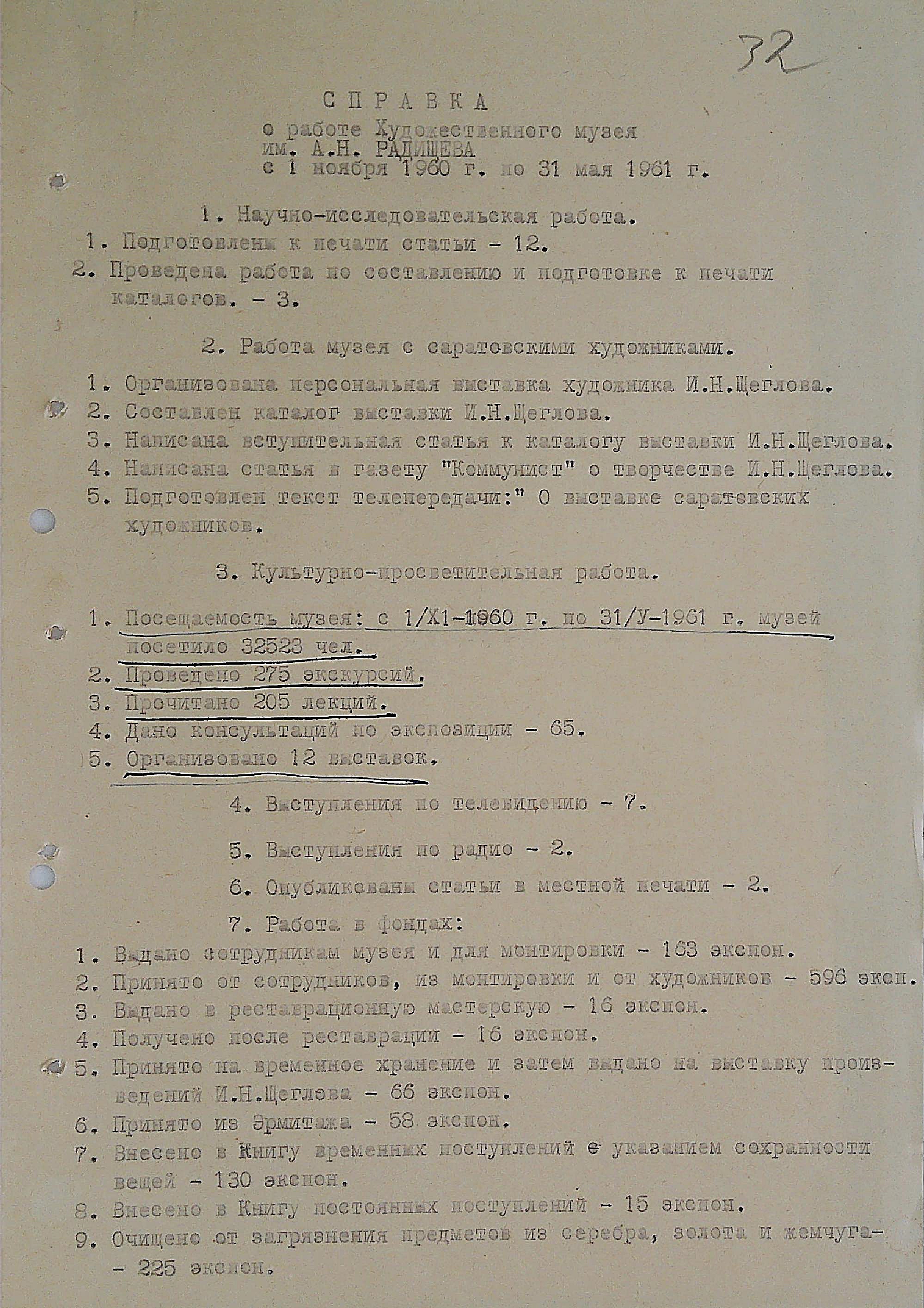 Справка о работе Саратовского государственного художественного музея им. А.Н. Радищева за период с 1 ноября 1960 г. по 31 мая 1961 г.