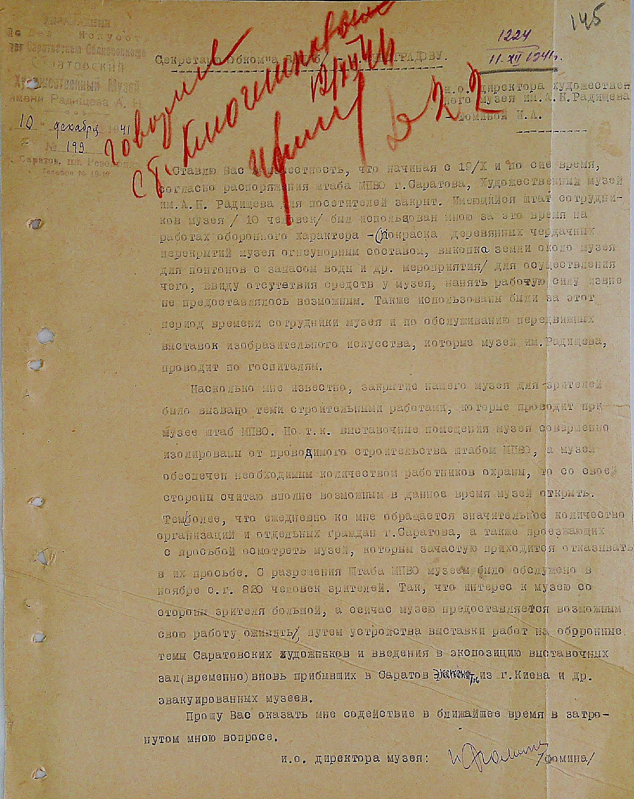 Докладная записка и.о. директора художественного музея им. А.Н. Радищева И.А. Фоминой секретарю Саратовского обкома ВКП(б) по пропаганде И.Т. Виноградову с просьбой открыть музей для посетителей.