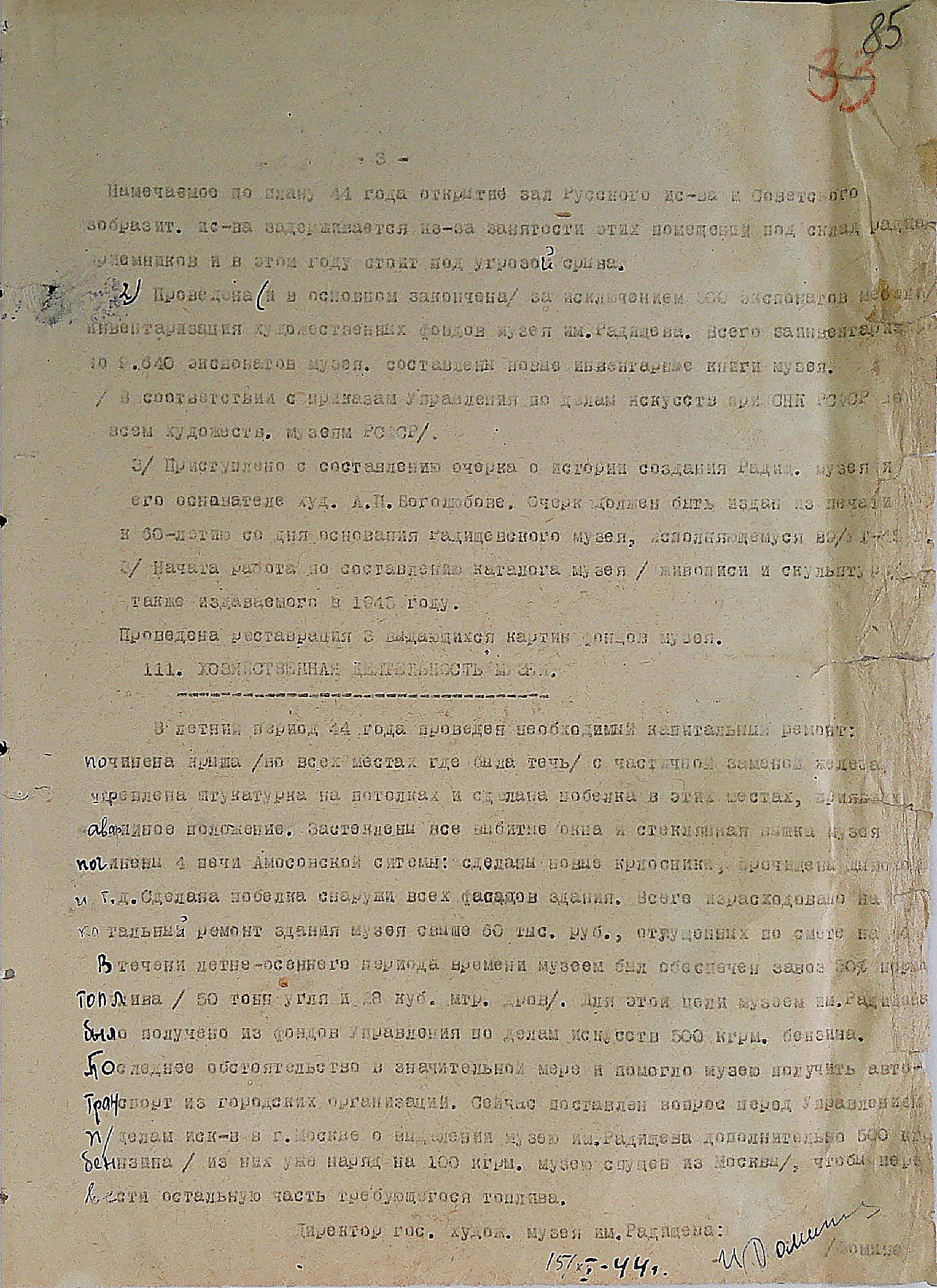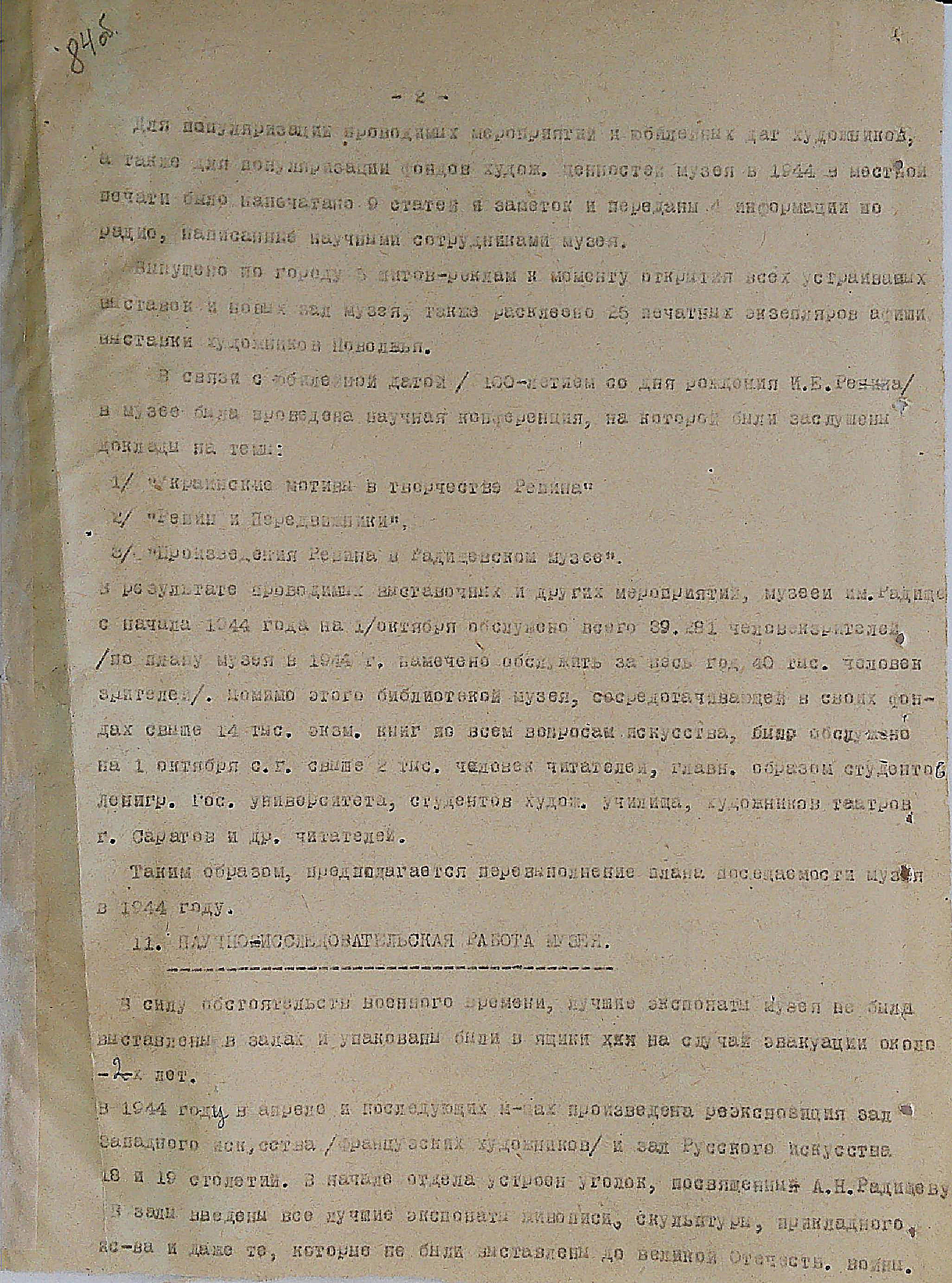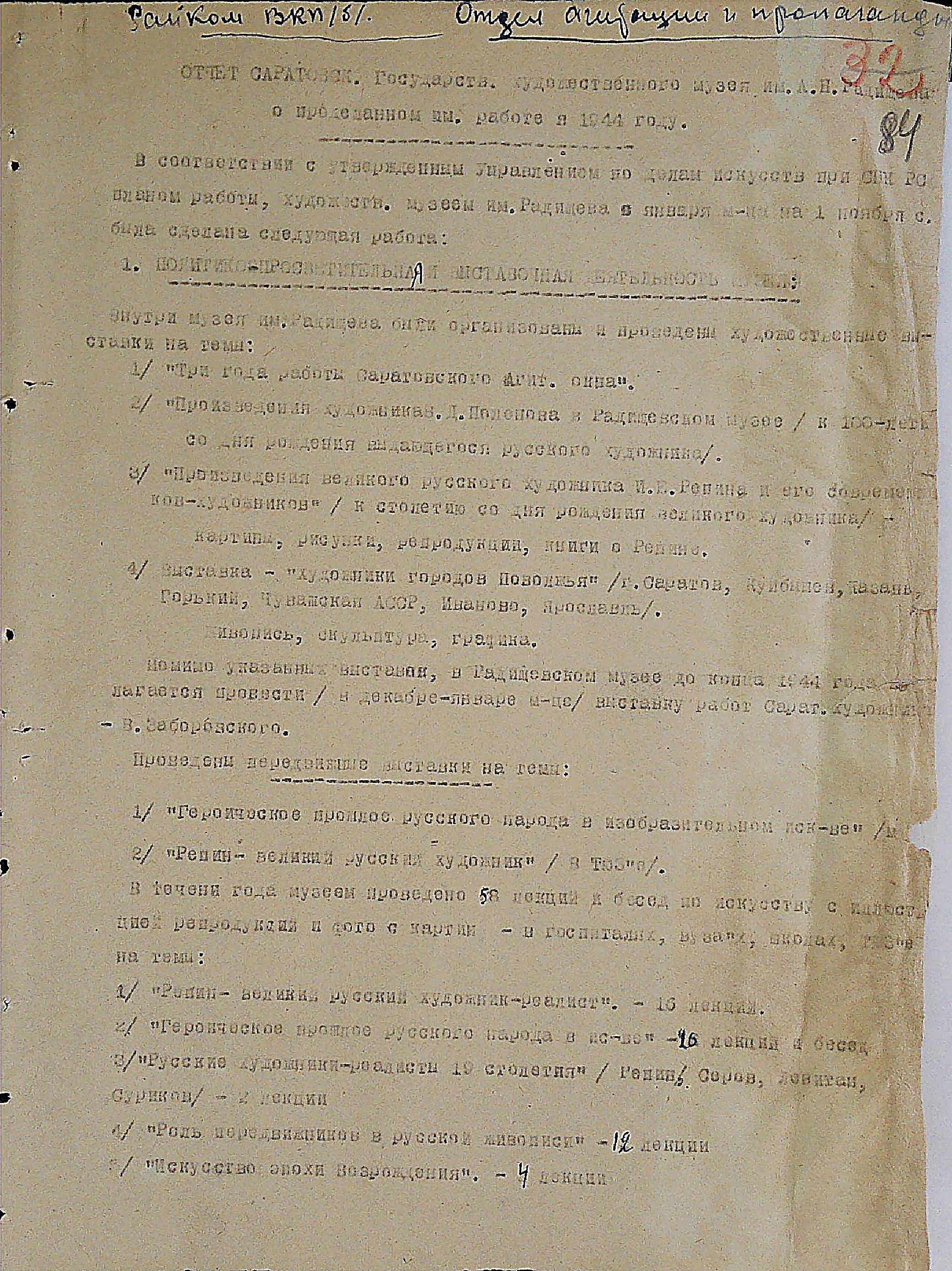Отчёт о работе Саратовского государственного художественного музея им. А.Н. Радищева в 1944 г.