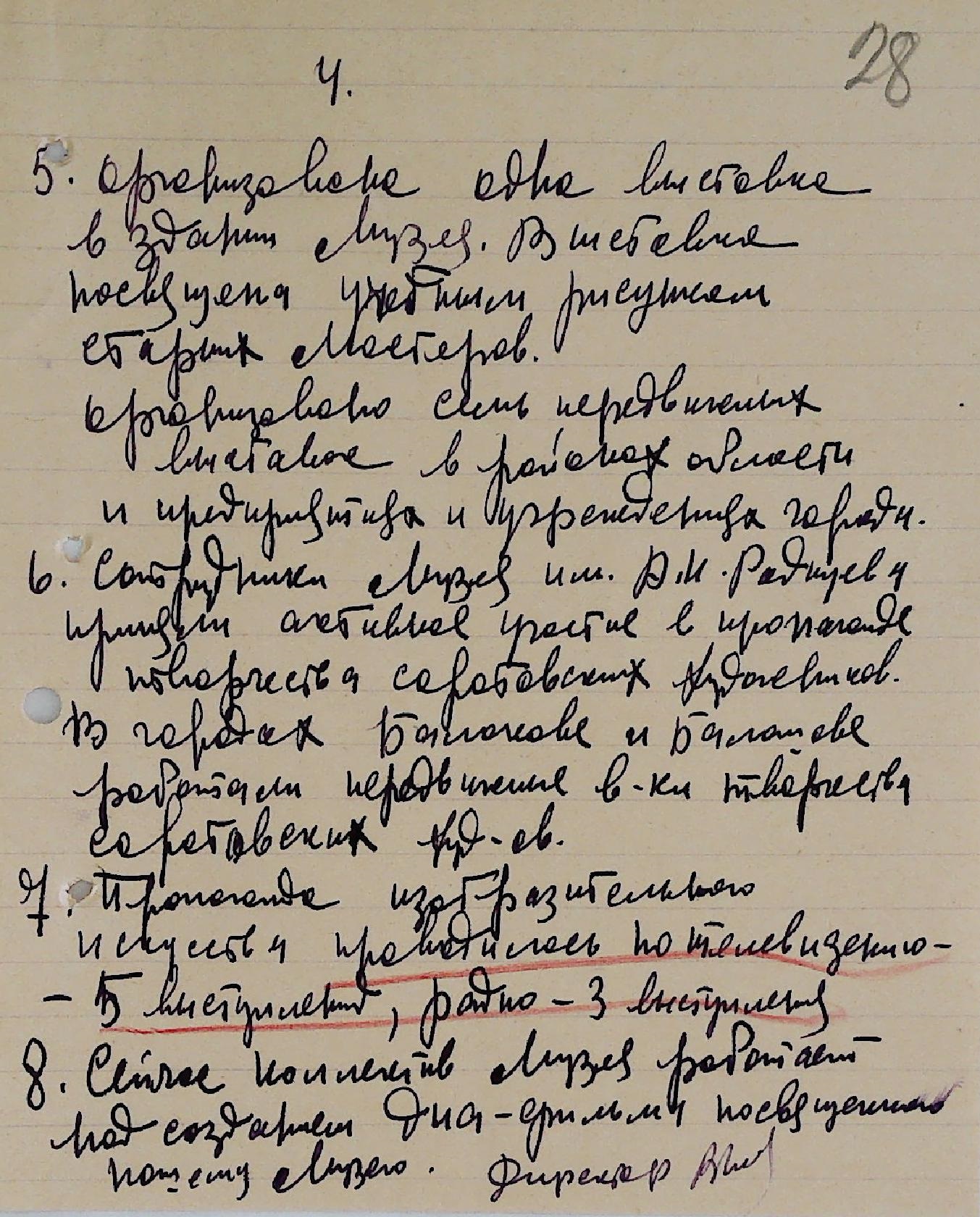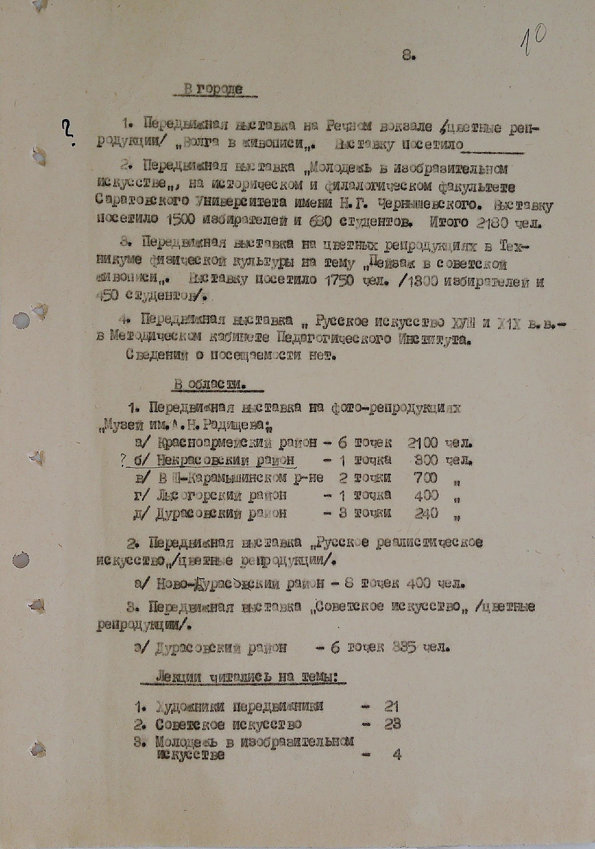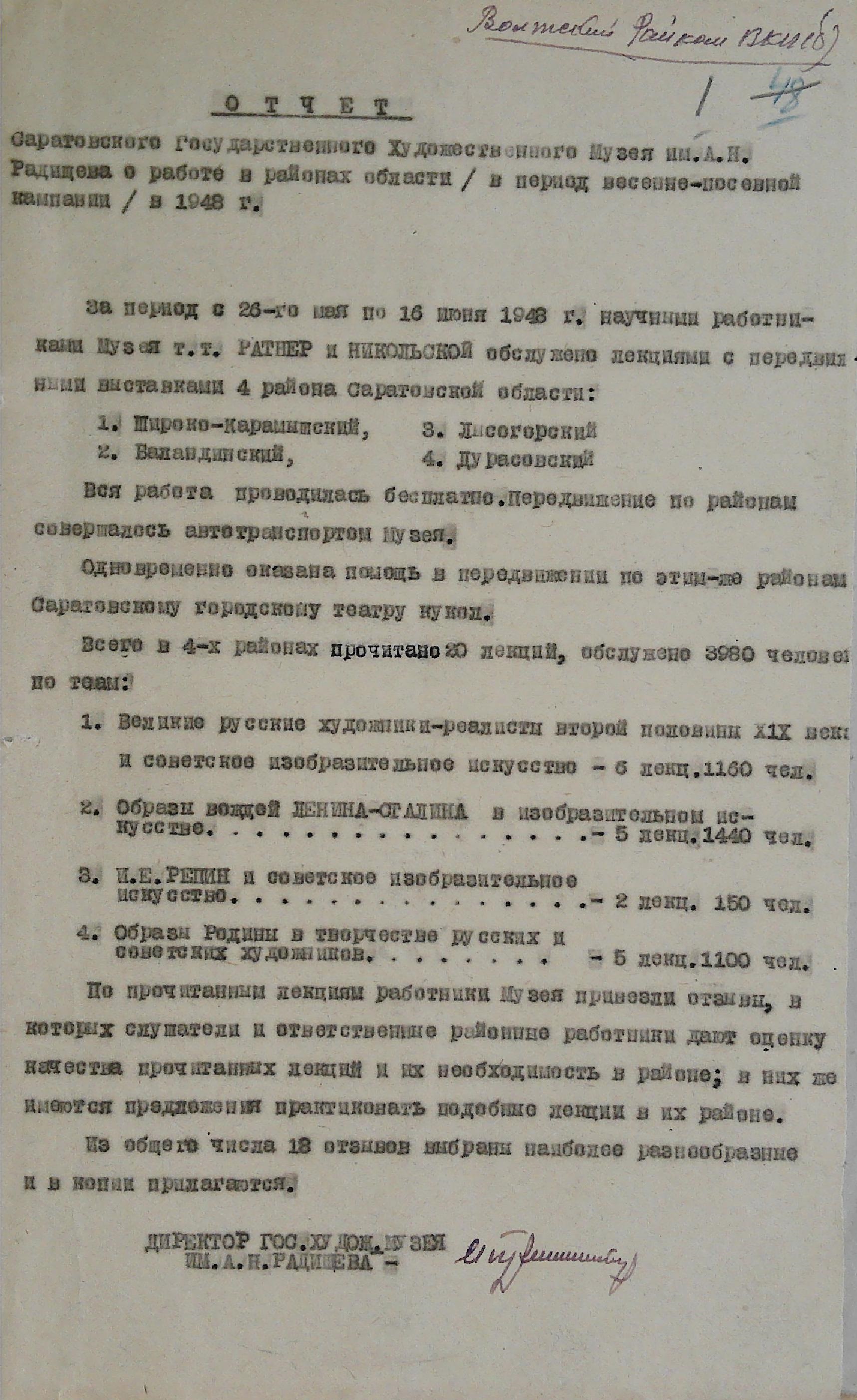 Отчёт Саратовского государственного художественного музея им. А.Н. Радищева о работе в районах в период посевной кампании 1948 г.