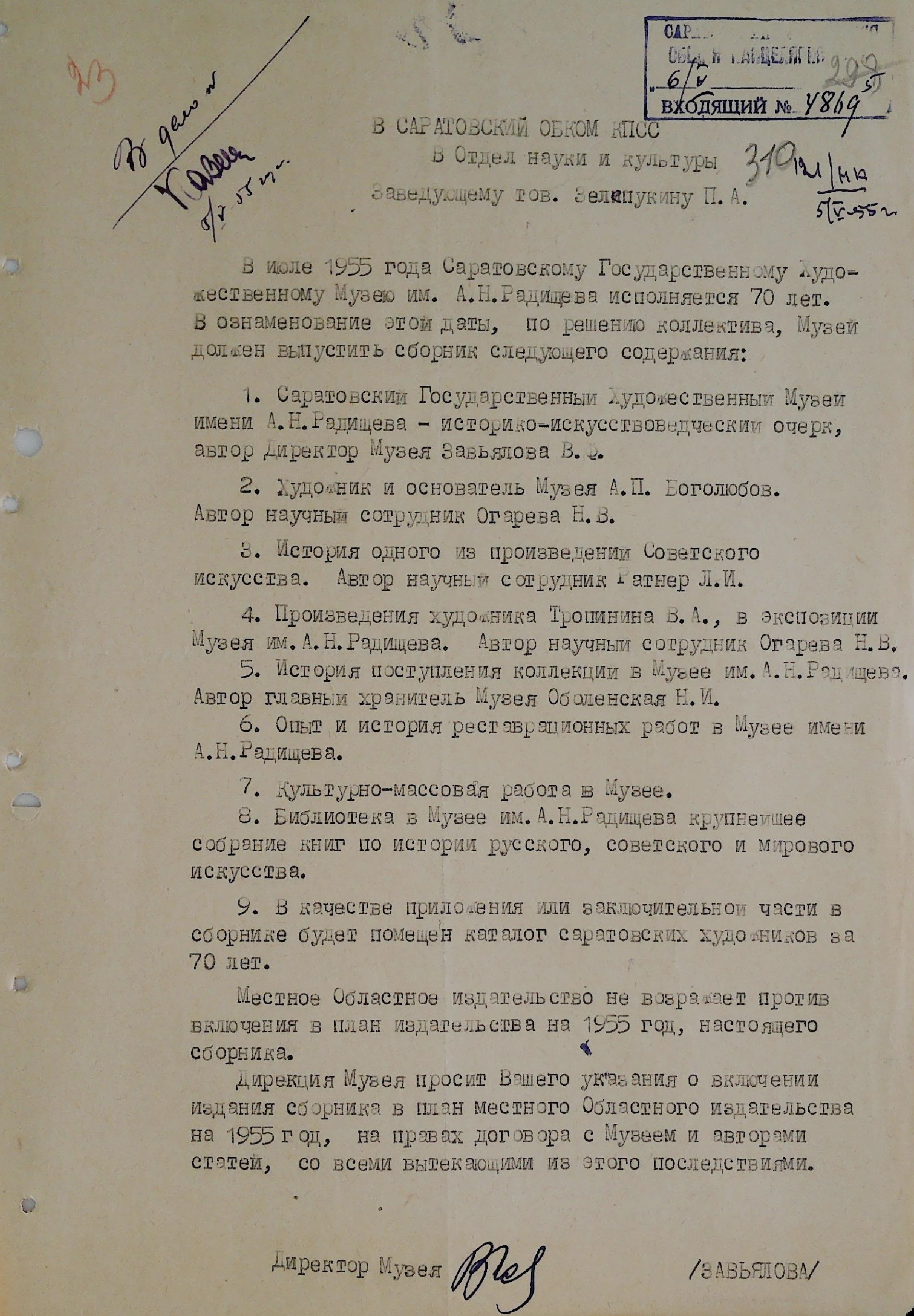 Сообщение директора Саратовского государственного художественного музея им. А.Н. Радищева В.Ф. Завьяловой заведующему отделом науки и культуры Саратовского обкома КПСС П.А. Зелепукину о возможности издания сборника в честь 70-летнего юбилея музея.