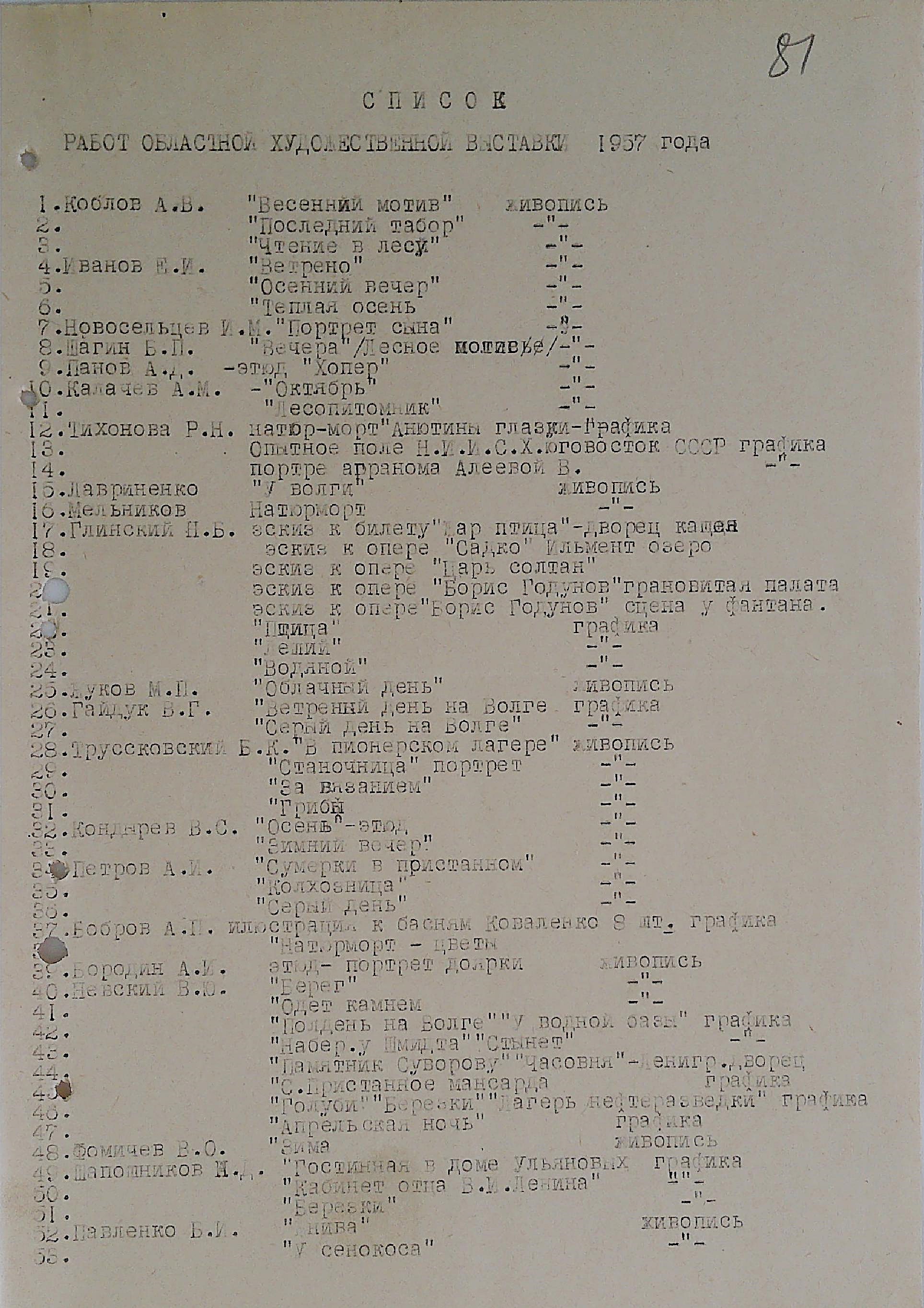 План организации художественной выставке к 40-летию Советской власти и список представляемых работ.