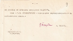Постановление бюро Саратовского крайкома ВКП(б) «Предложение комиссии т. Татулова об открытии исторического факультета СГУ» (протокол от 5 октября 1935 г. № 100).