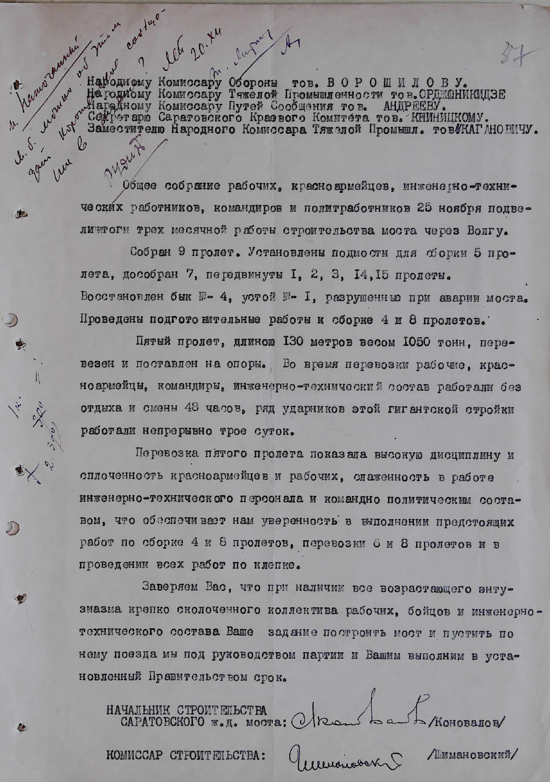 Под руководством Госпроекттранса Народного комиссариата путей сообщения к 1930 г. разработан проект опор железнодорожного моста. По решению организационного комитета ВЦИК по Саратовскому краю от 1934 г., руководителем строительства назначен - Коновалов Леонид Иванович.