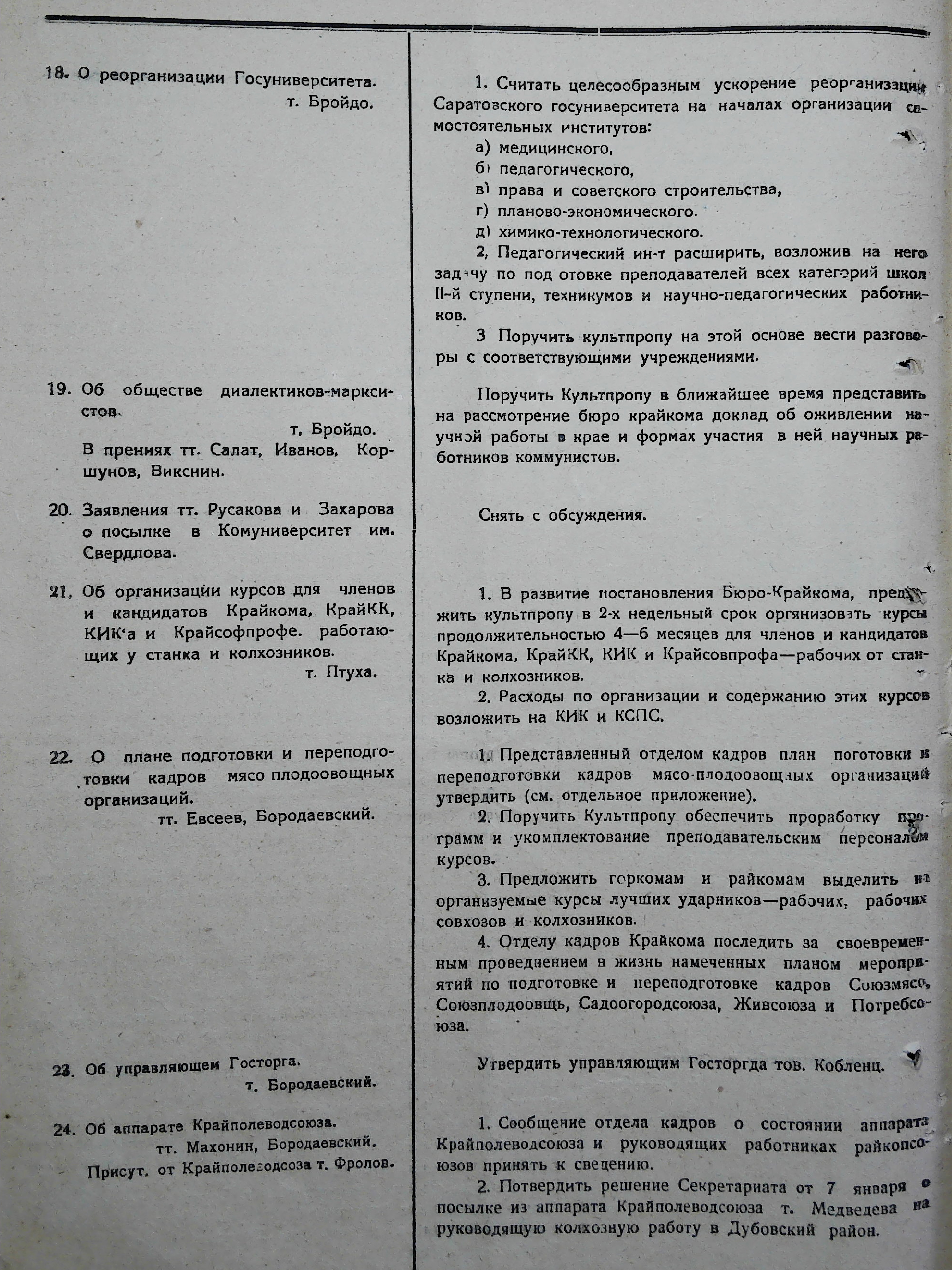 Постановление секретариата Нижне-Волжского крайкома ВКП(б) «О реорганизации Госуниверситета».
