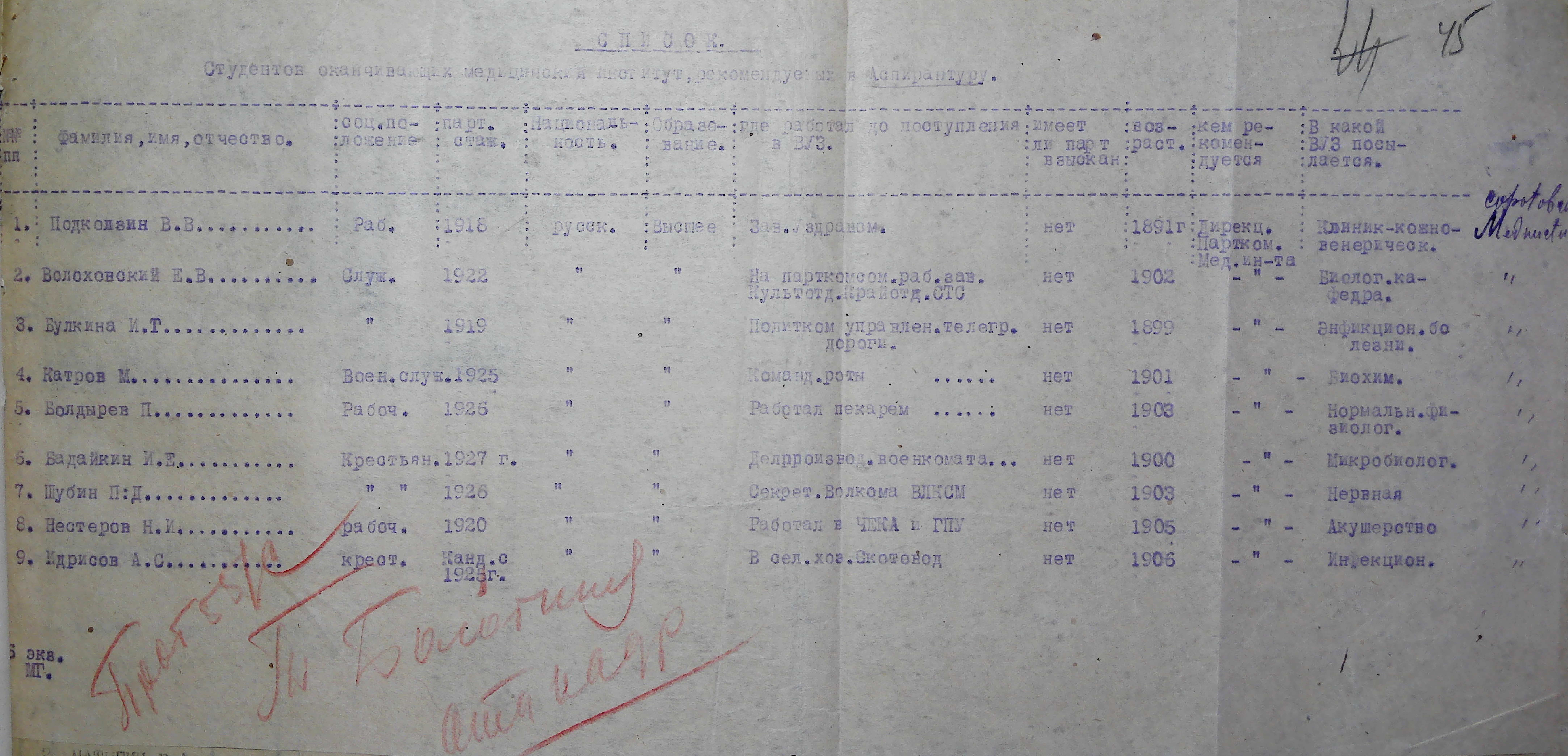 Список студентов, оканчивающих медицинский институт, рекомендуемых в аспирантуру.