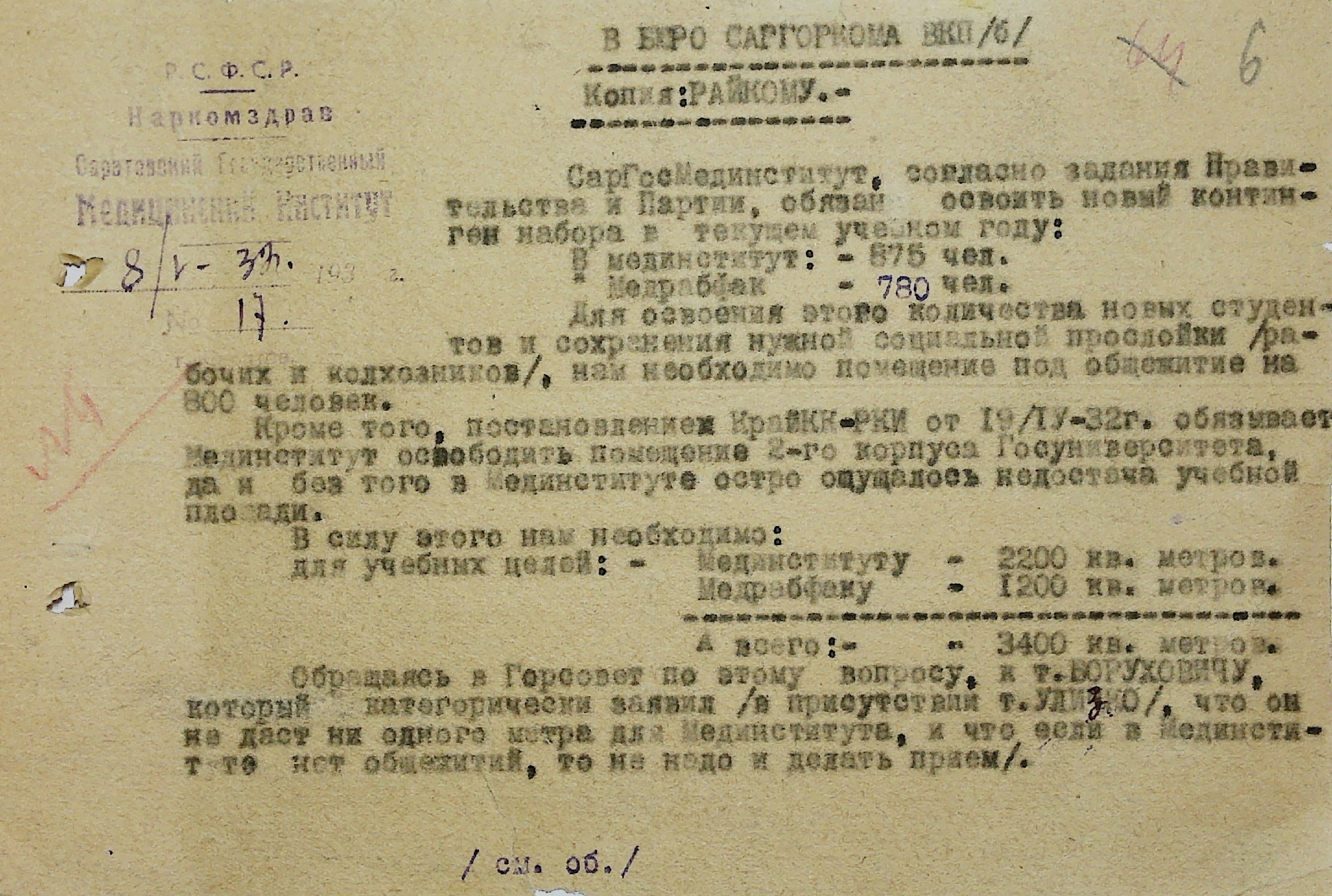 Сообщение в бюро Саратовского горкома ВКП(б) с просьбой выделить помещение для организации в нем общежития медицинского института.