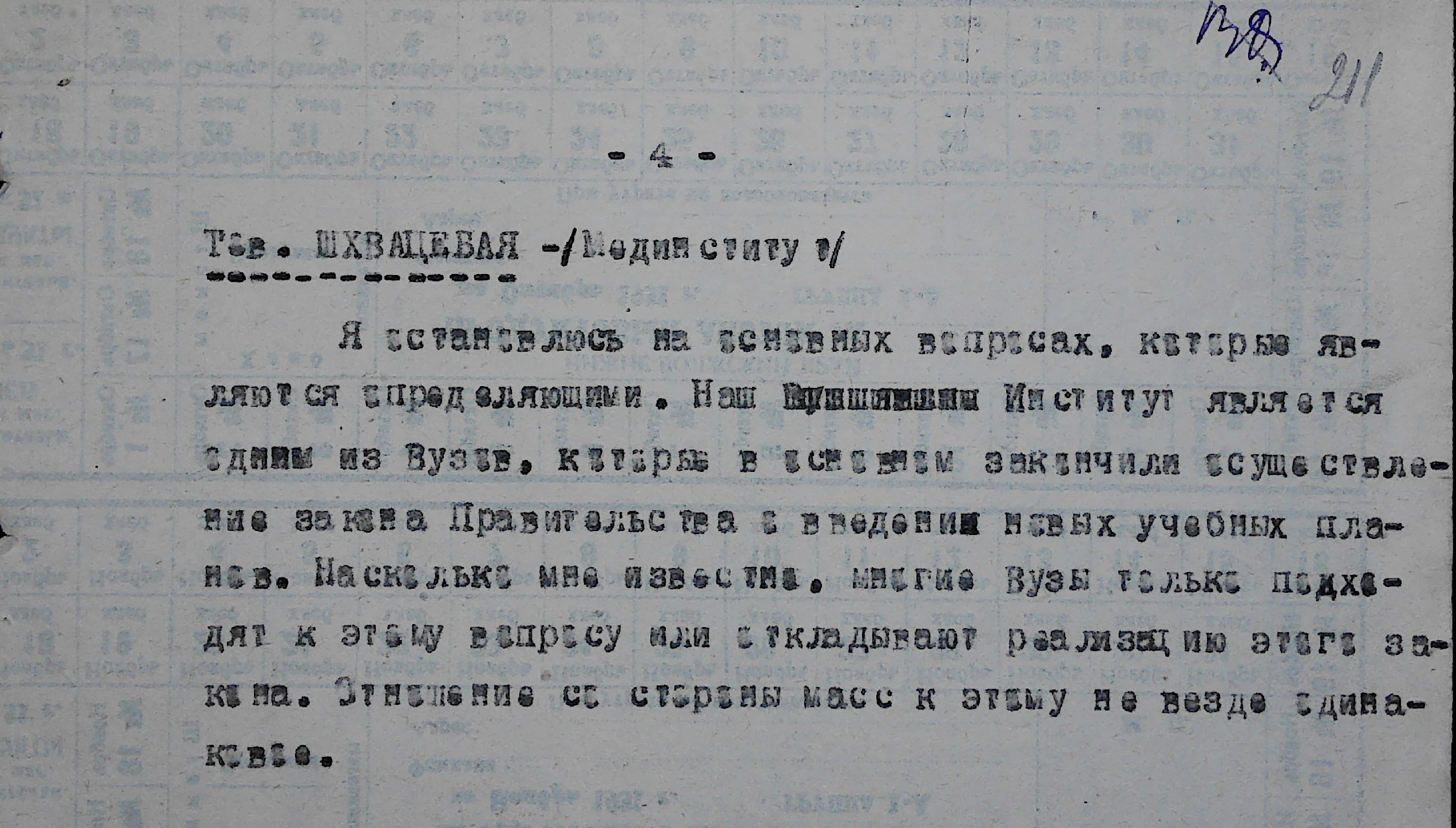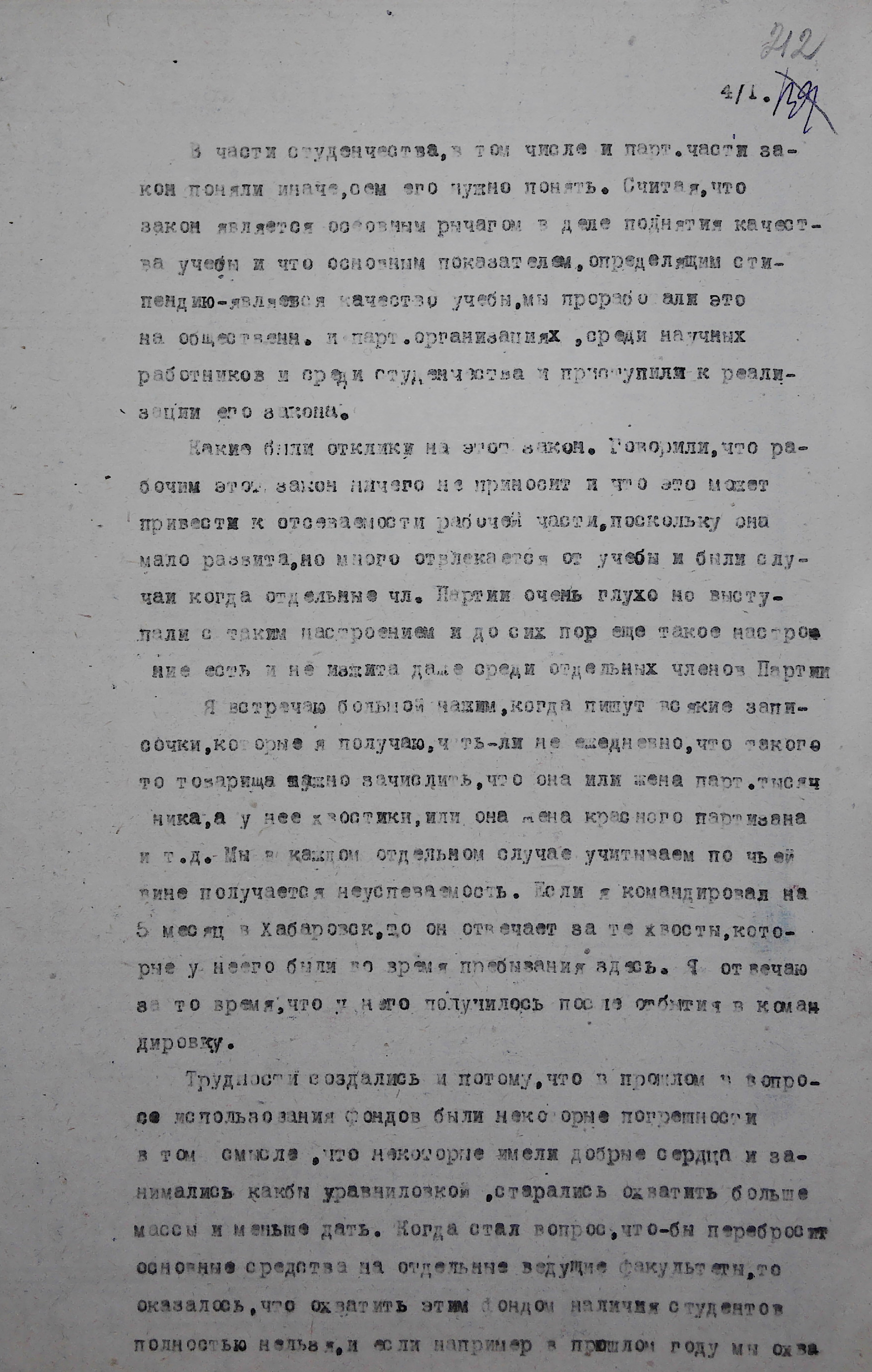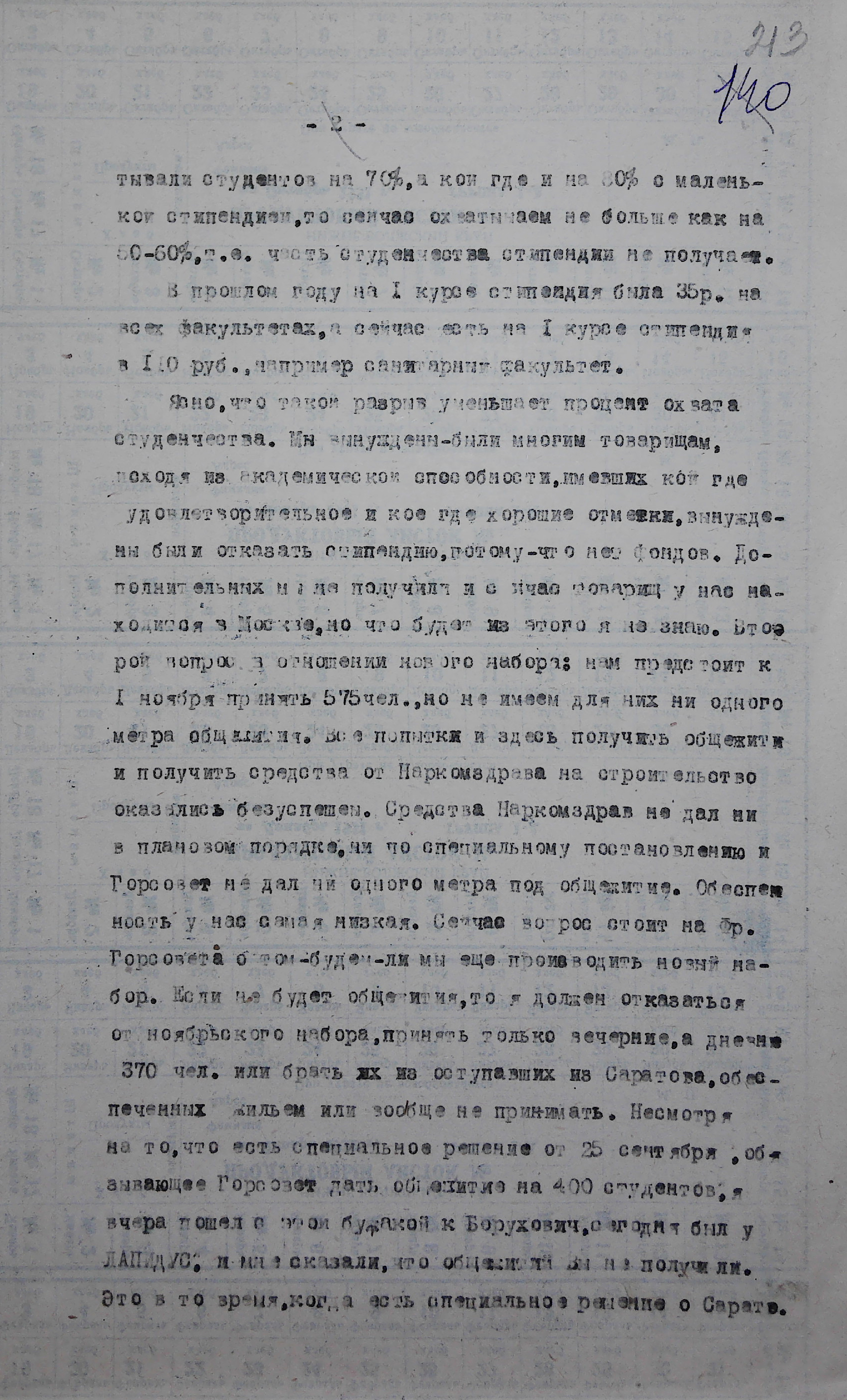В своем докладе Шхвацабай К.Я. особо акцентирует внимание на снижении возможности института охватывать весь состав студенчества стипендией в соответствии с законом, а также на нехватке мест в общежитиях института для размещения студентов предстоящего набора.