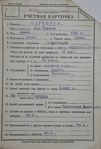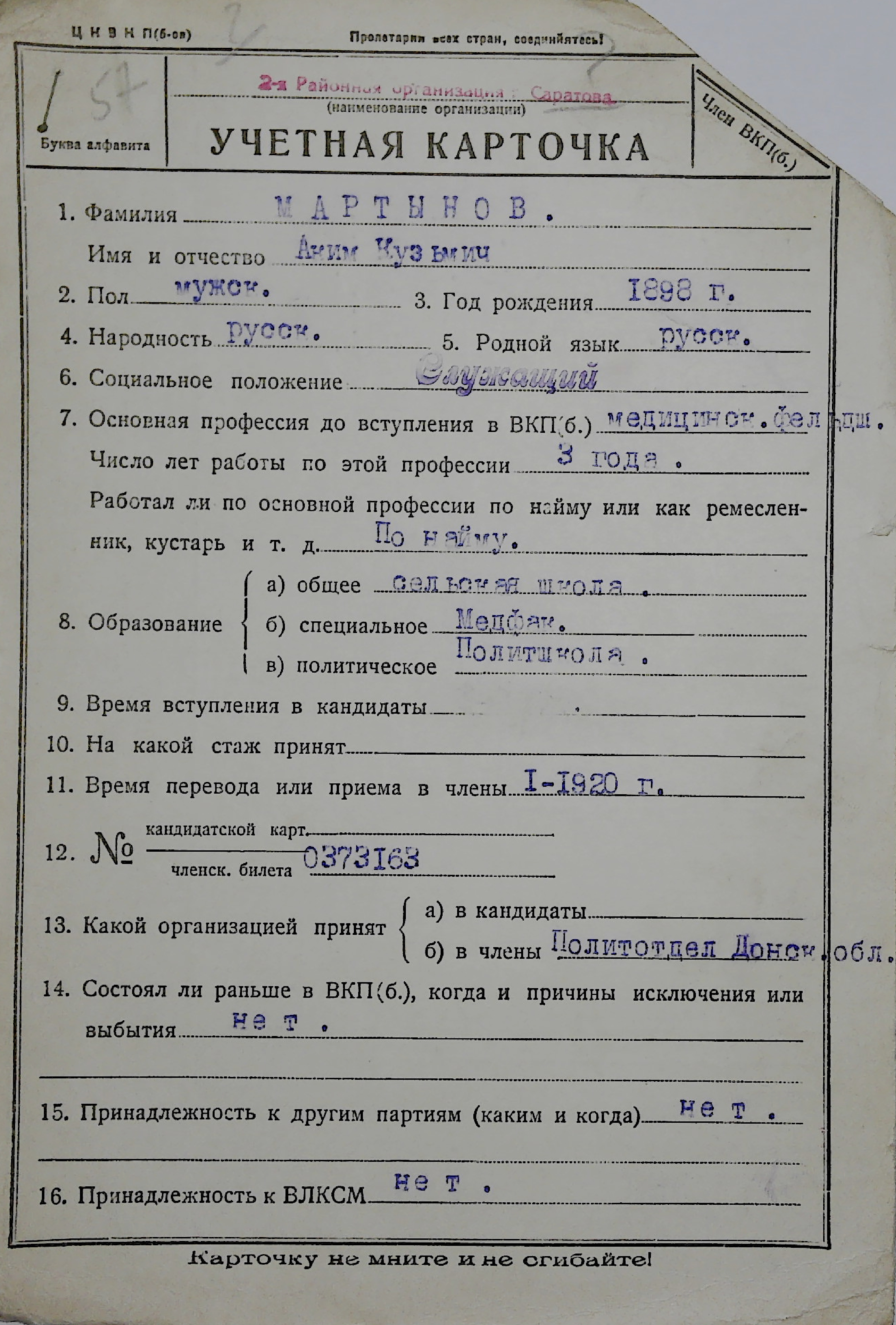Учётная карточка члена ВКП(б) (образца 1926 г.) Мартынова Акима Кузьмича.