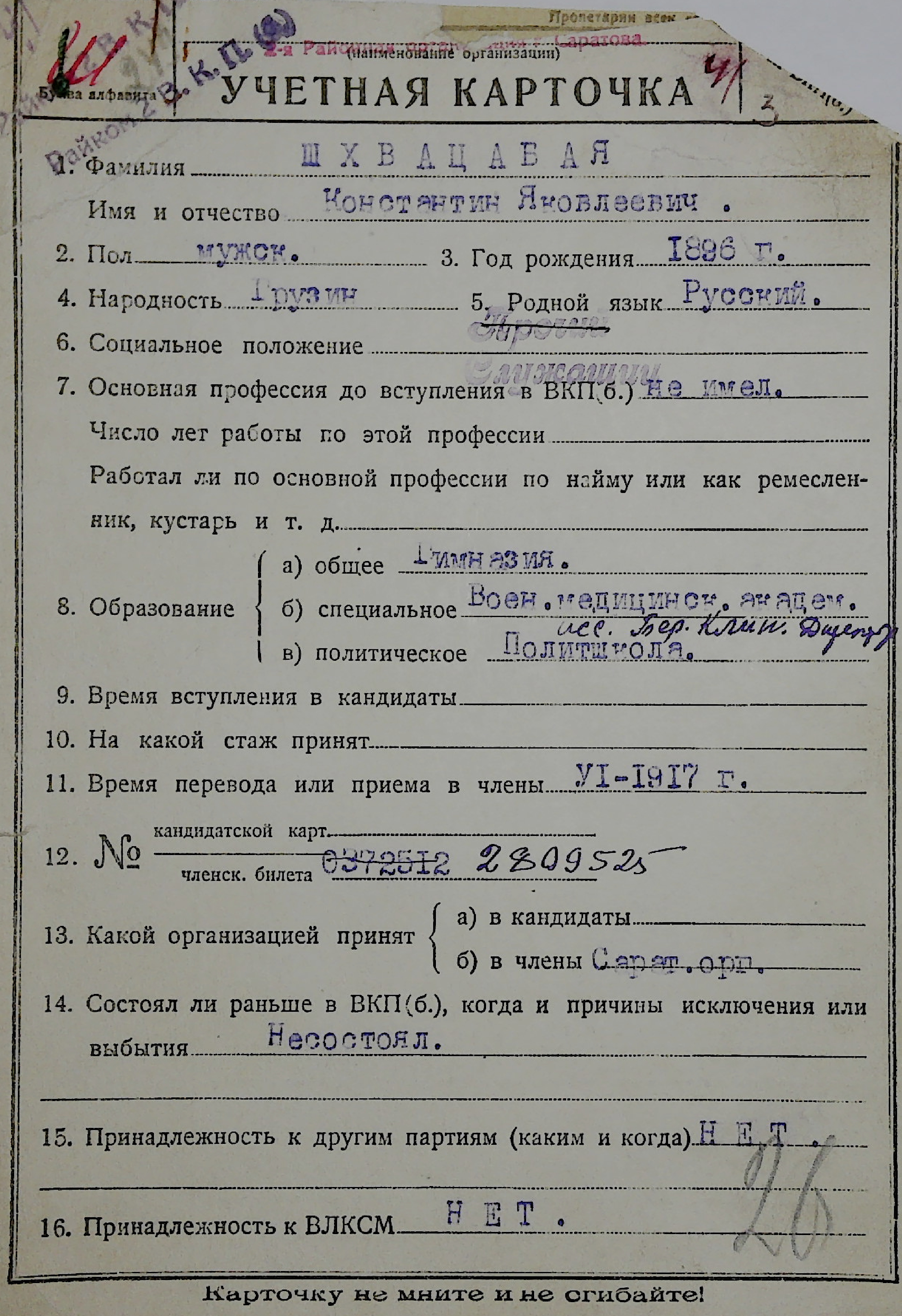 Учётная карточка члена ВКП(б) (образца 1926 г.) Шхвацабая Константина Яковлевича.
