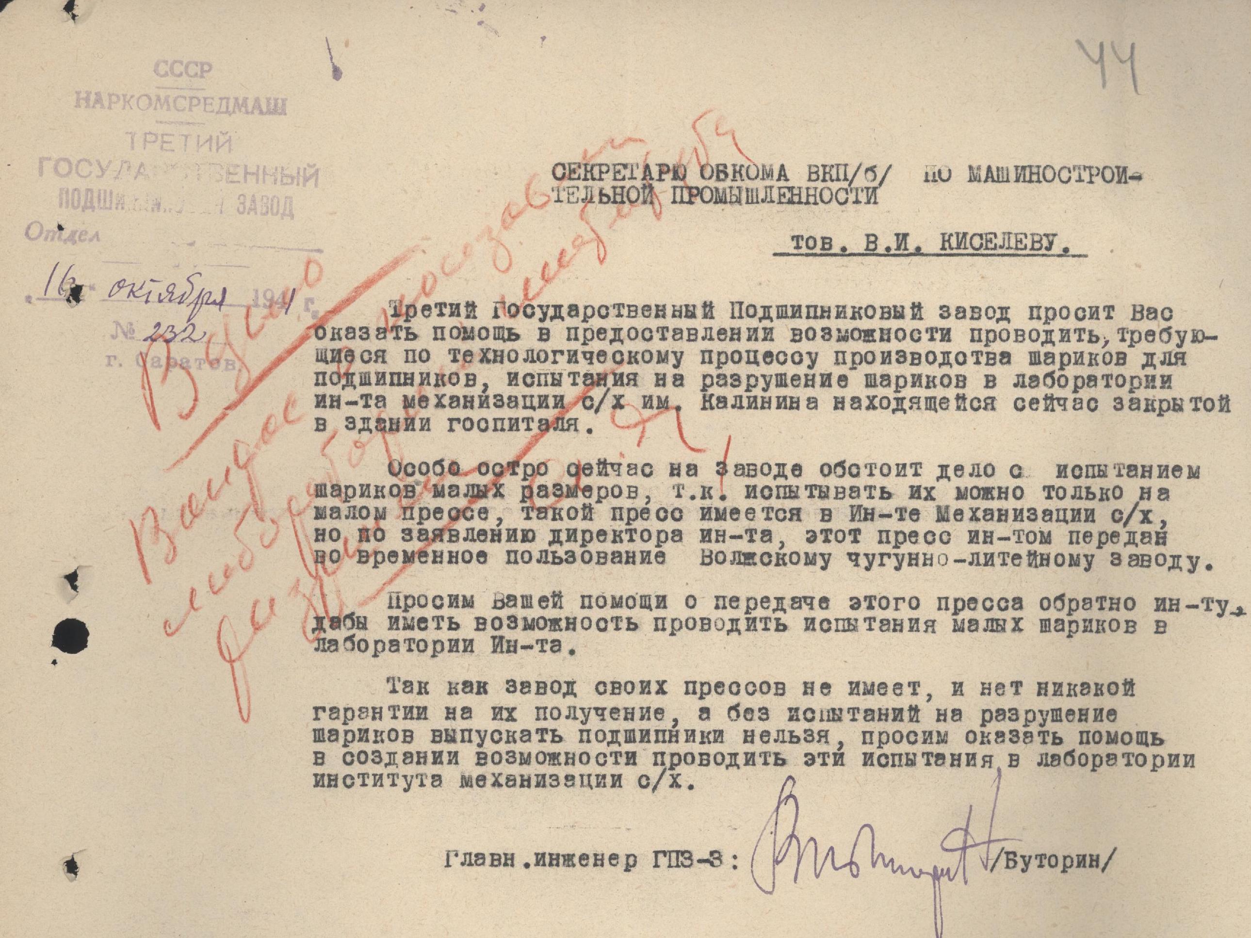 Сообщение главного инженера ГПЗ-3 В.С. Буторина секретарю Саратовского обкома ВКП(б) по машиностроительной промышленности В.И. Киселеву с просьбой о предоставлении доступа к лаборатории института механизации сельского хозяйства им. Калинина.