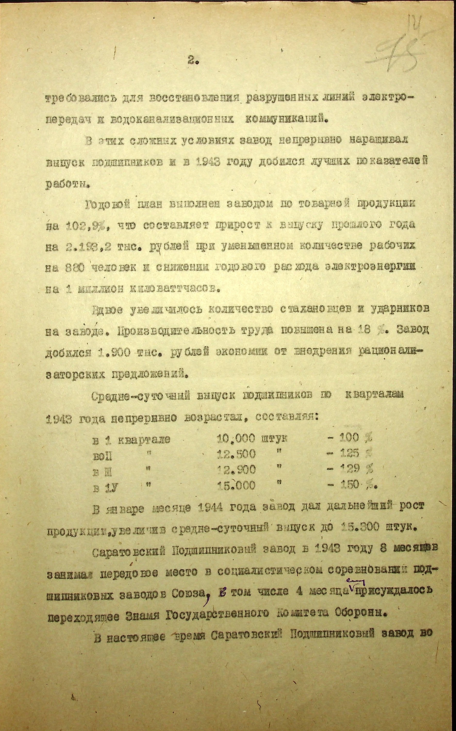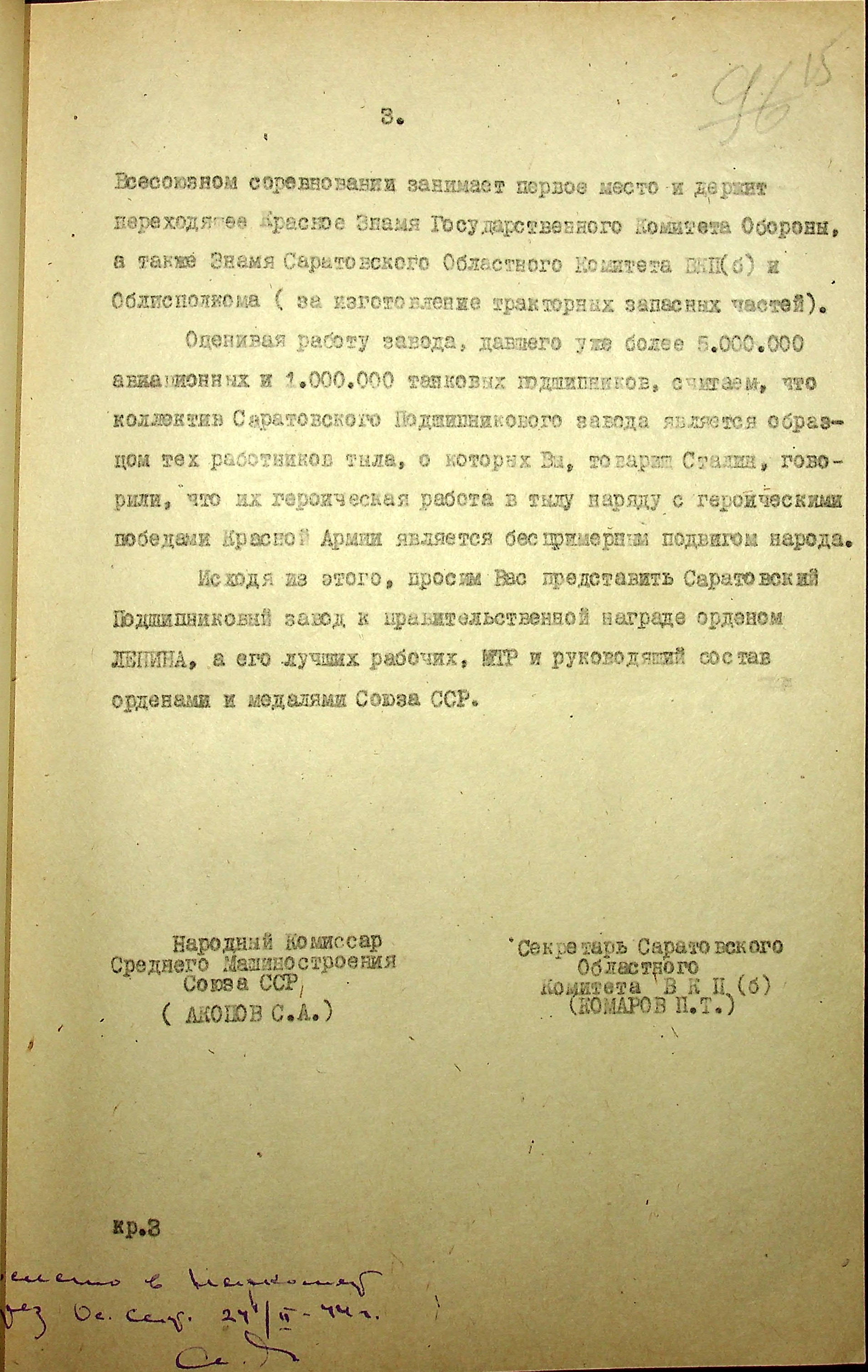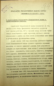 Докладная записка секретаря Саратовского обкома ВКП(б) П.Т. Комарова председателю ГКО И.В. Сталину о представлении Саратовского подшипникового завода к правительственной награде.
