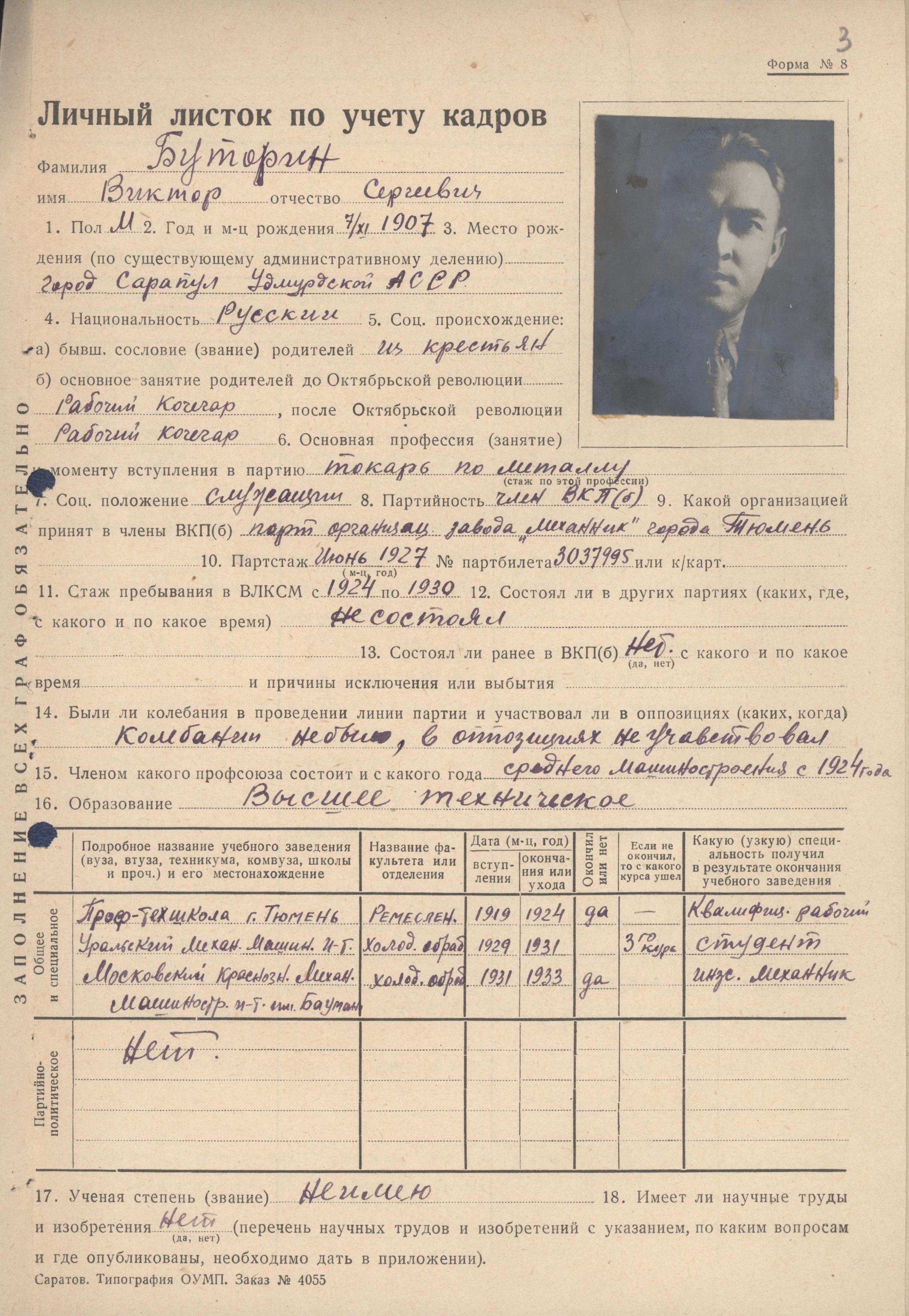 Фотография и личный листок по учету кадров В.С. Буторина (из личного дела номенклатурного работника)
