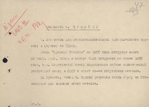 Сообщение о необходимости обращения к секретарю Сталинградского обкома ВКП(б) А.С. Чуянову для направления баржи с металлом из Сталинграда в Саратов для ГПЗ-3.