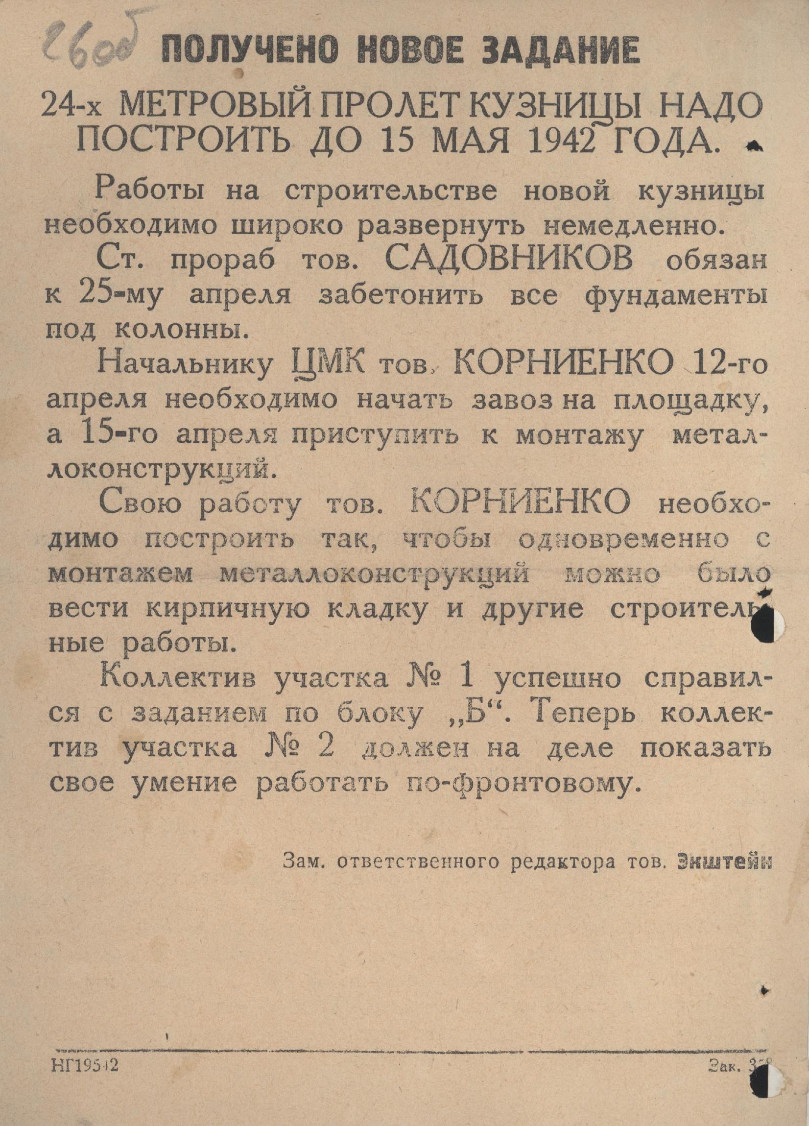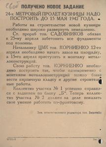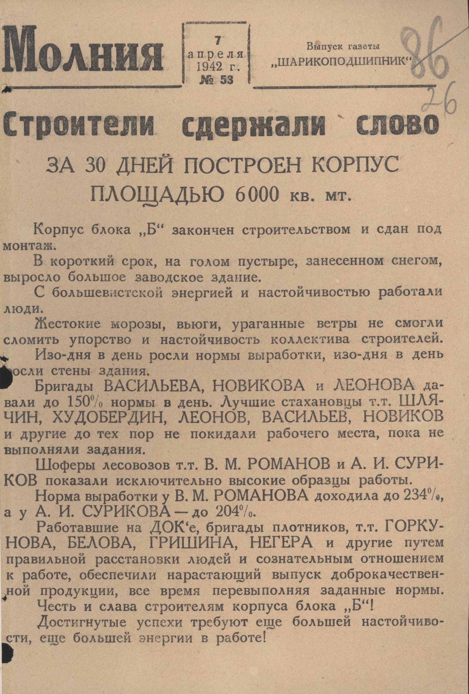 «Шарикоподшипник». 07.04.1942. № 53; ГАНИСО. Ф. 594. Оп. 1. Д. 2954. Л. 26-26 об.