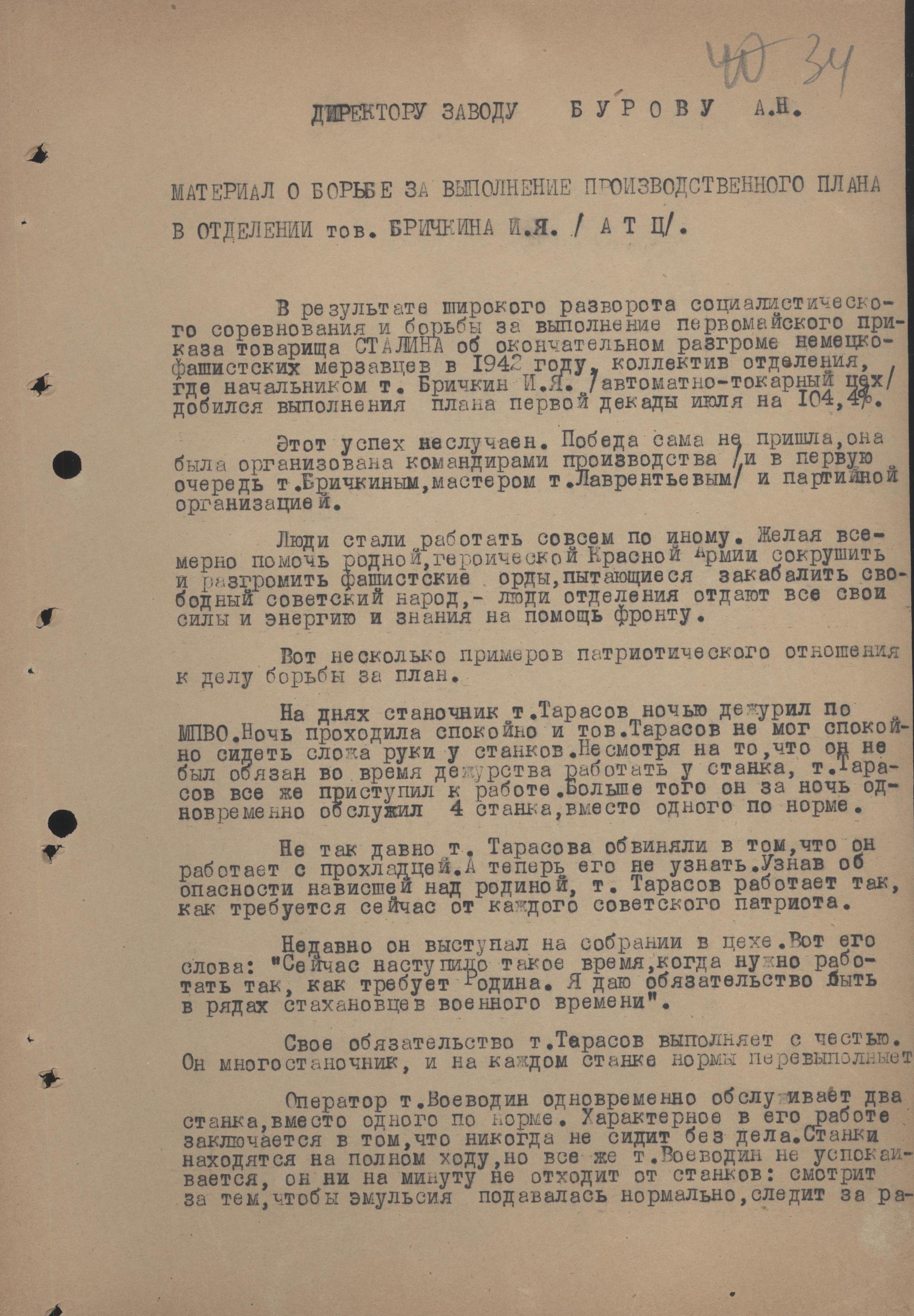 Записка директору Саратовского подшипникового завода А.Н. Бурову с информацией о патриотическом подъеме среди коллектива завода.