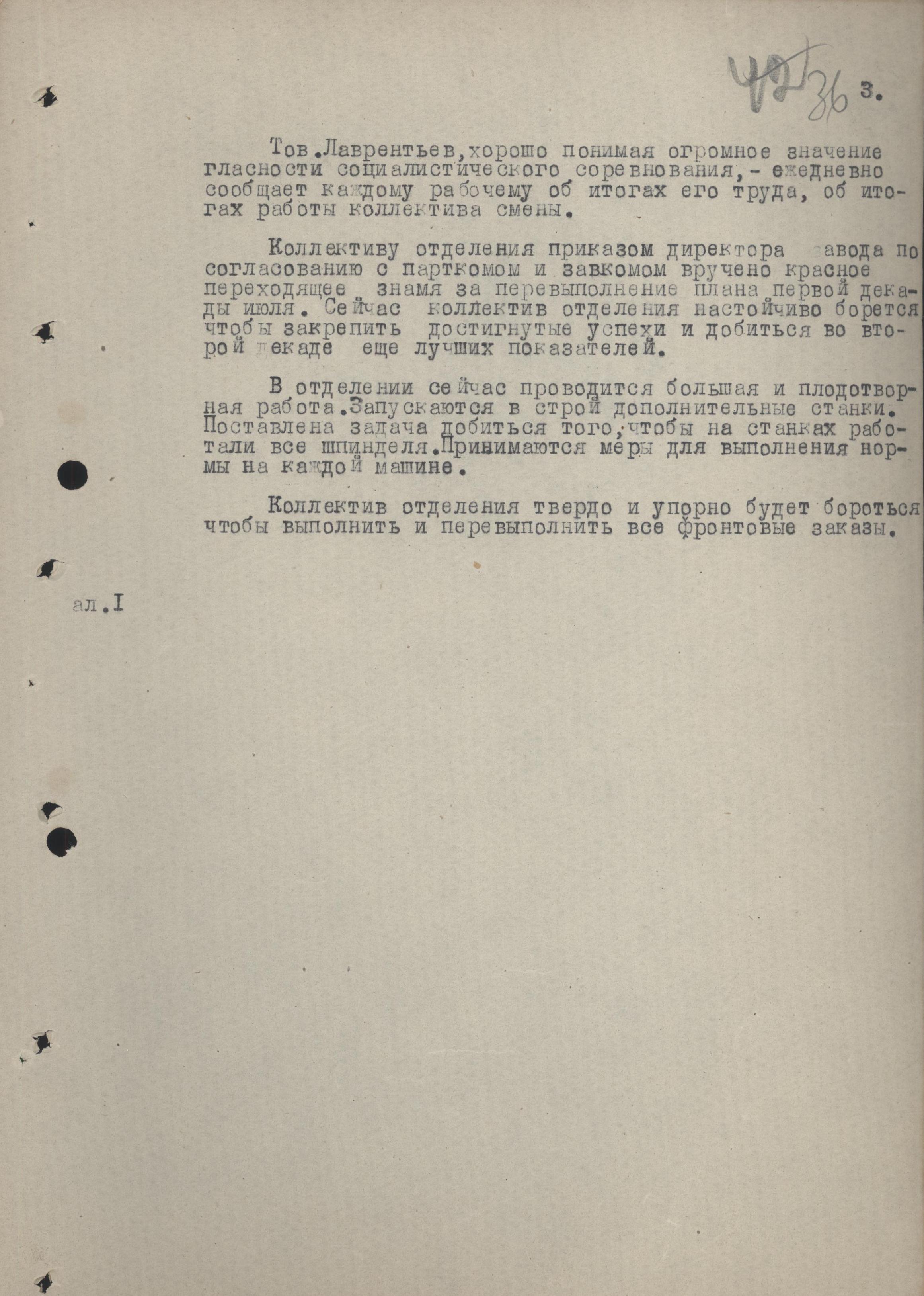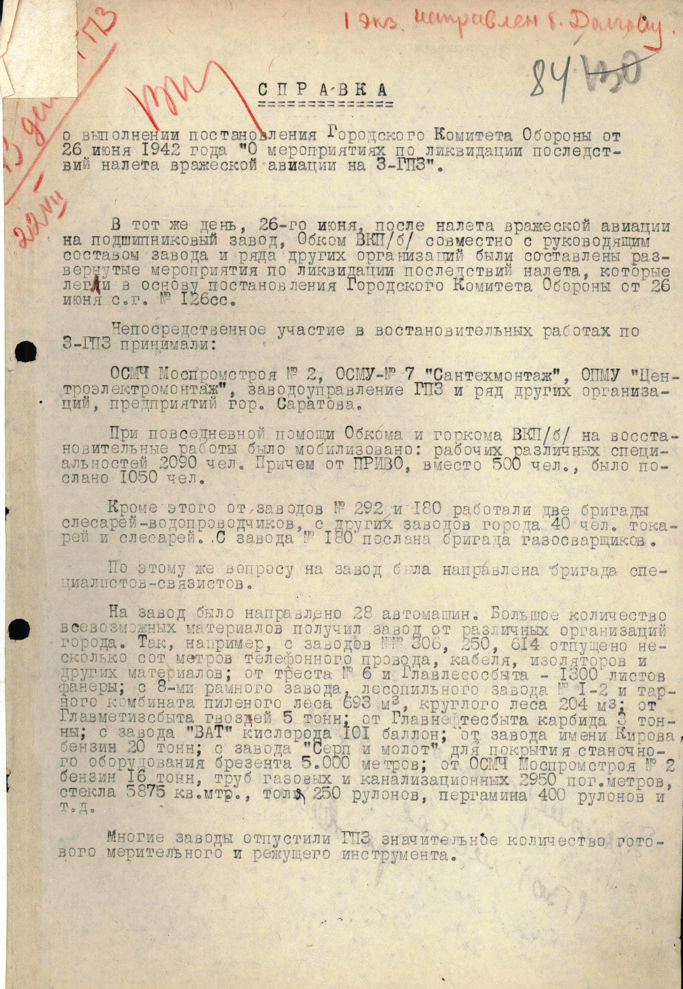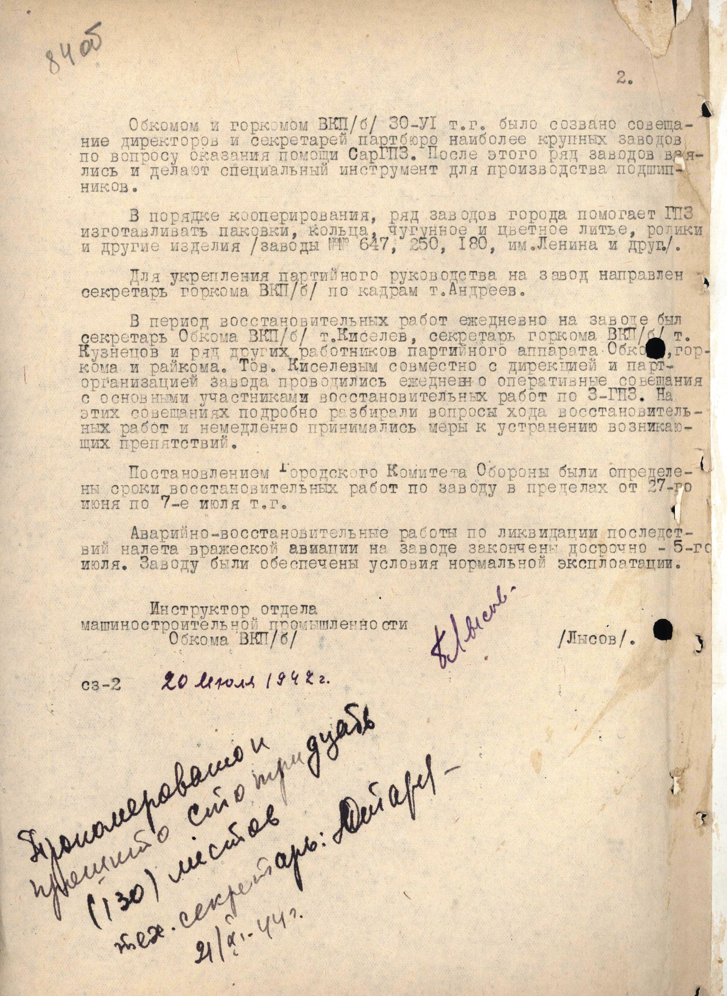 Справка инструктора отдела машиностроительной промышленности Саратовского обкома ВКП(б) Лысова о выполнении постановления ГКО от 26 июня 1942 г. «О мероприятиях по ликвидации последствий налета вражеской авиации на 3-ГПЗ».