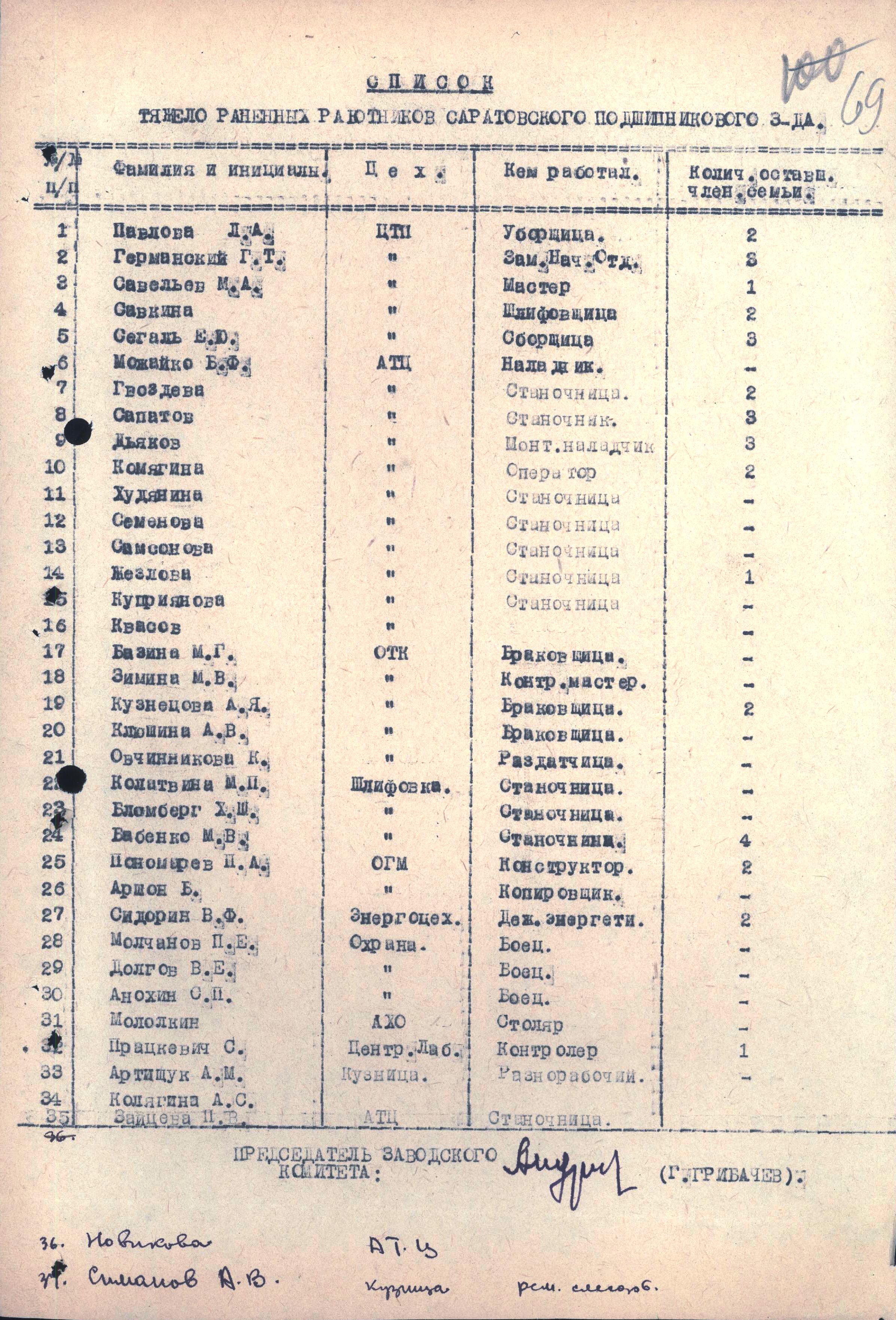 Список тяжело раненных работников Саратовского подшипникового завода.
