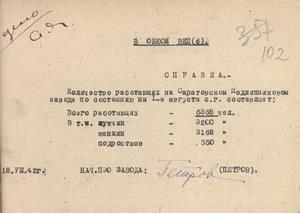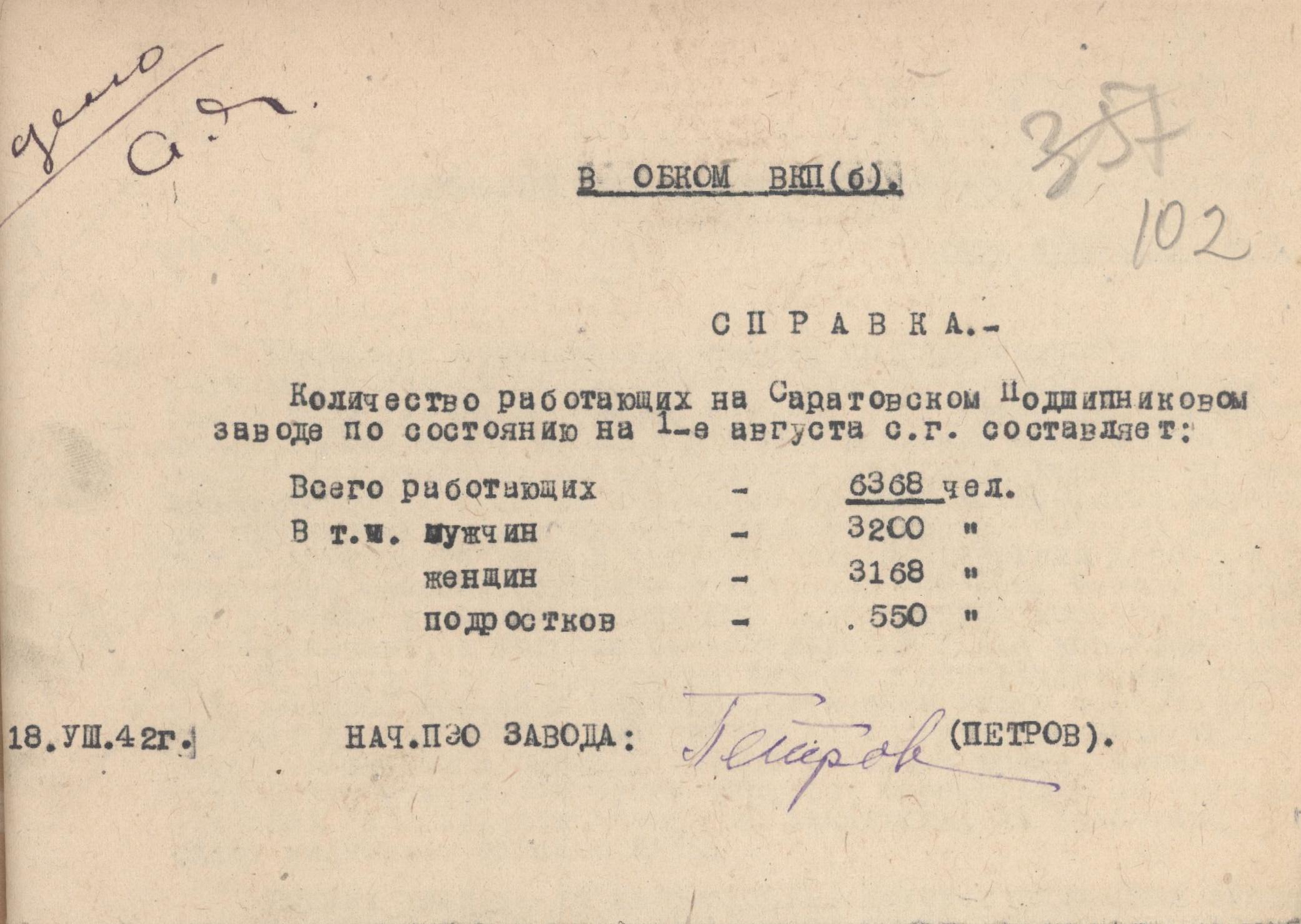 Справка начальника планово-экономического отдела завода Петрова в Саратовский обком ВКП(б) о количестве работающих на Саратовском подшипниковом заводе по состоянию на 1 августа 1942 г.