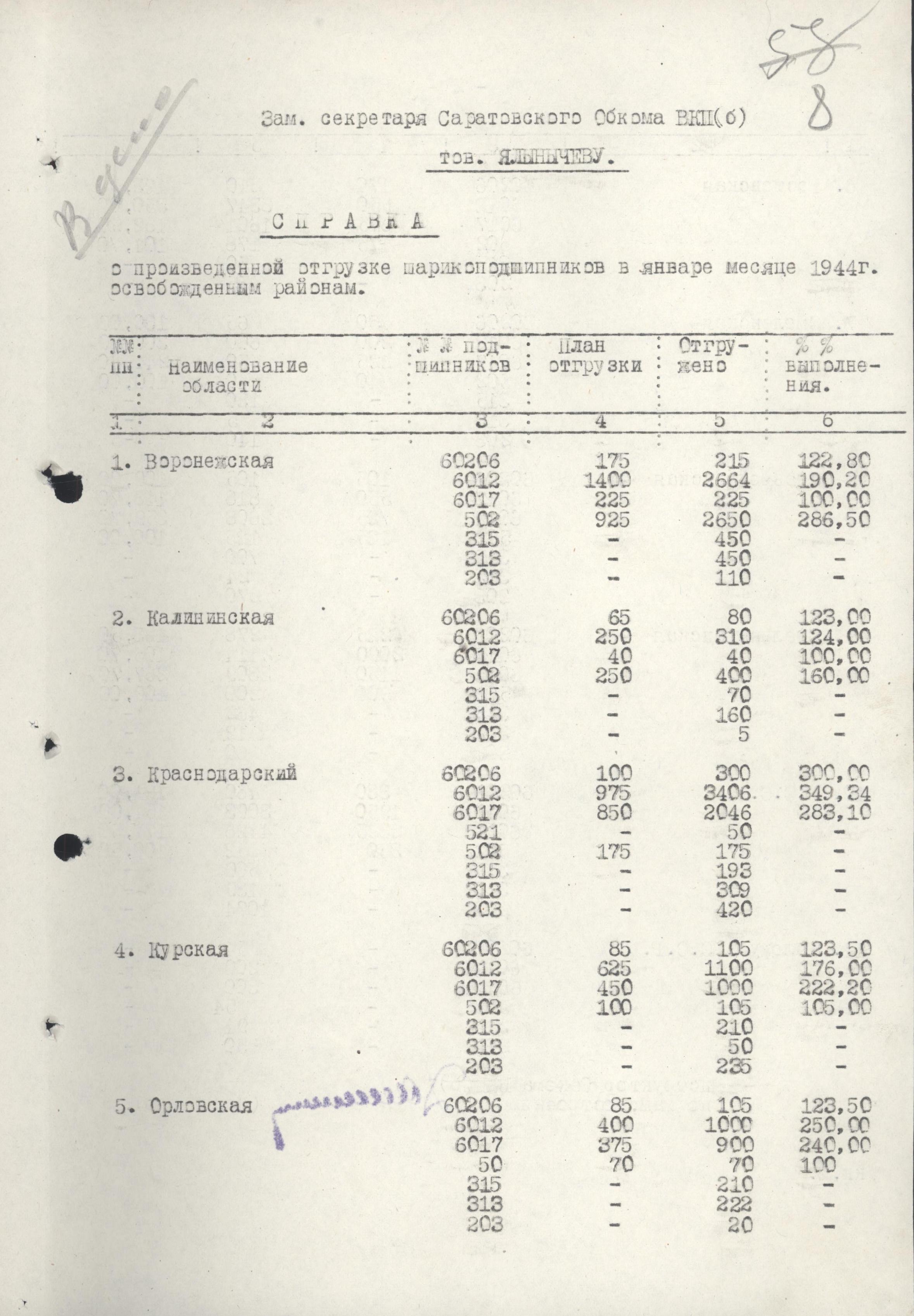 Справка инструктора Саратовского обкома ВКП(б) по машиностроению Даниленко зам. секретаря Саратовского обкома ВКП(б) Ялынычеву о произведенной отгрузке шарикоподшипников в январе 1944 г. освобожденным районам.