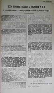 В начале 1922 вышла в свет общая директива секретаря ЦК РКП(б) В.М. Молотова о постановке антирелигиозной пропаганды и о ее методах. На ее основе разработали циркуляр «О постановке антирелигиозной пропаганды». Основной акцент в документе сделан на усилении антирелигиозной кампании. В циркулярном письме декларировался довольно осторожный подход к религиозной проблеме.