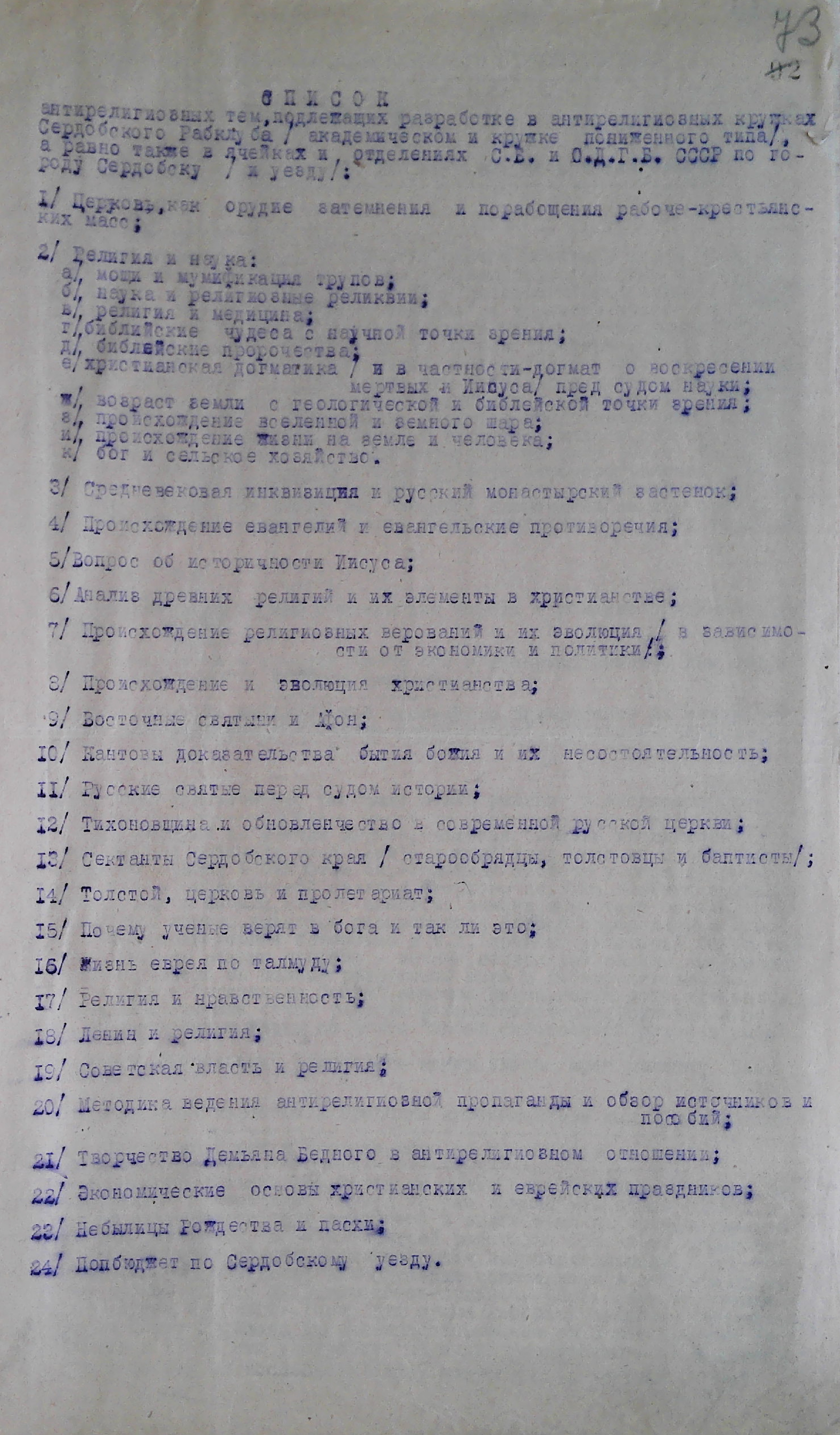 Список тем, подлежащих обсуждению в антирелигиозных кружках, в ячейках и отделениях Союза безбожников СССР города Сердобска.