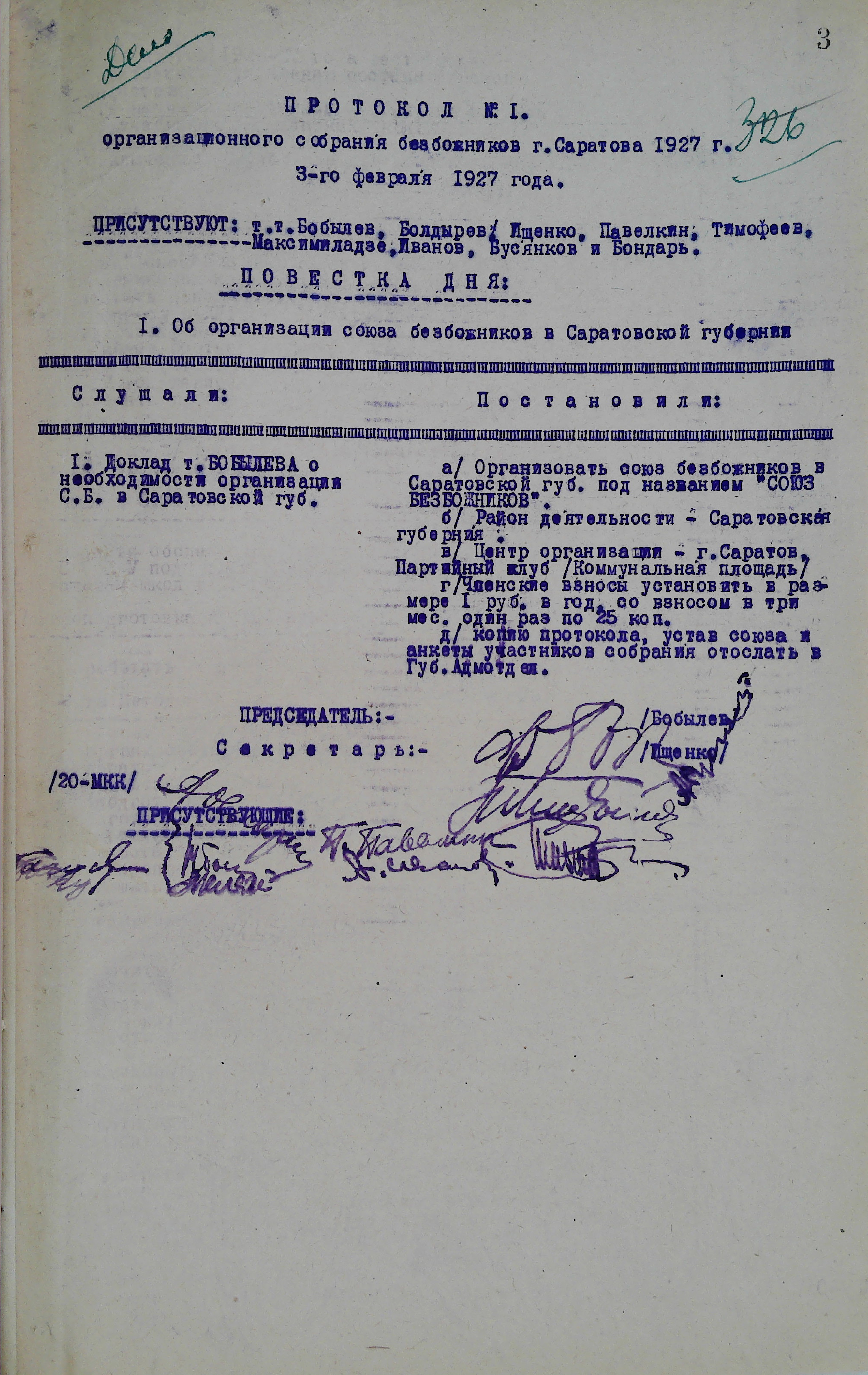 Протокол № 1 организационного собрания безбожников г. Саратова