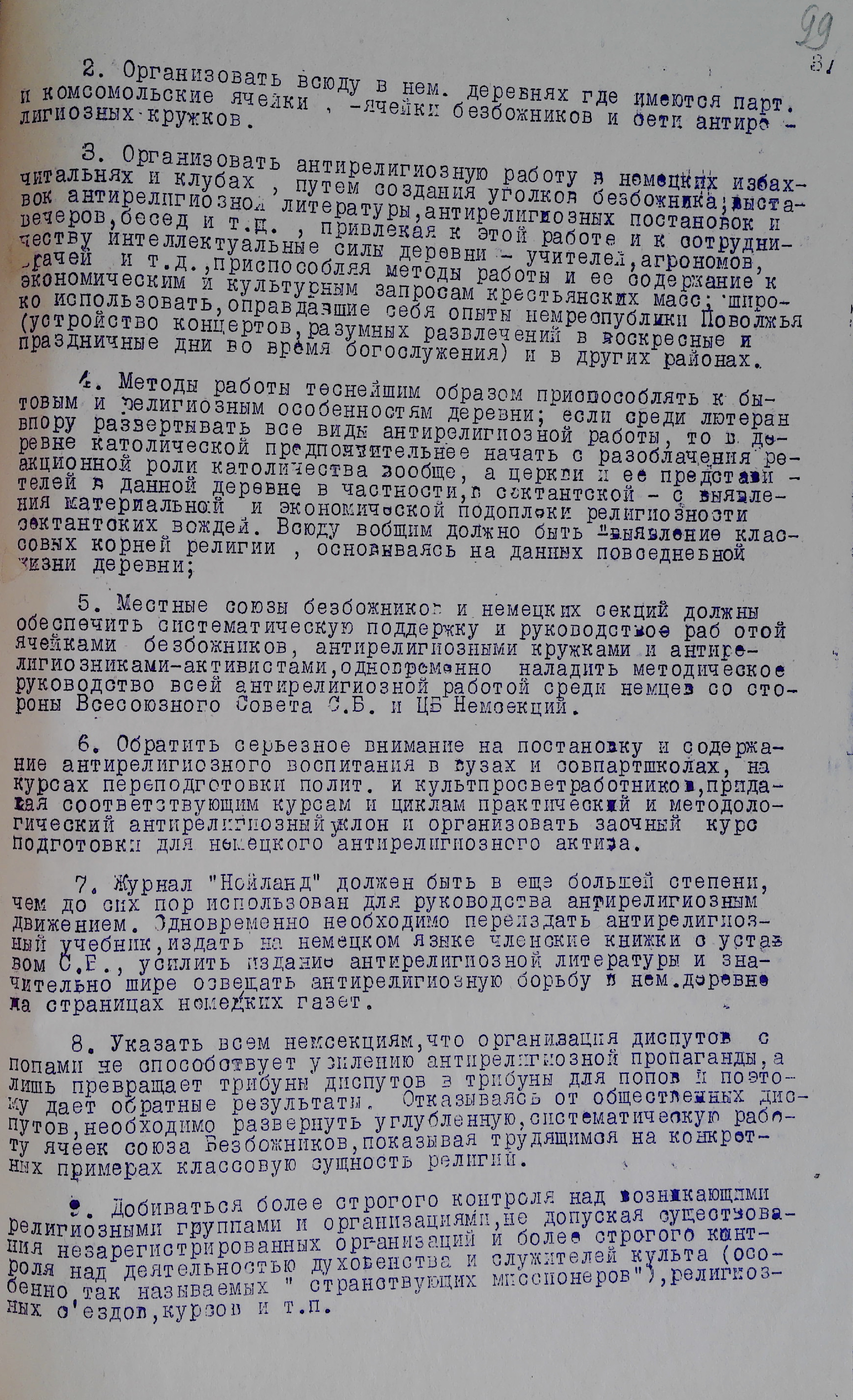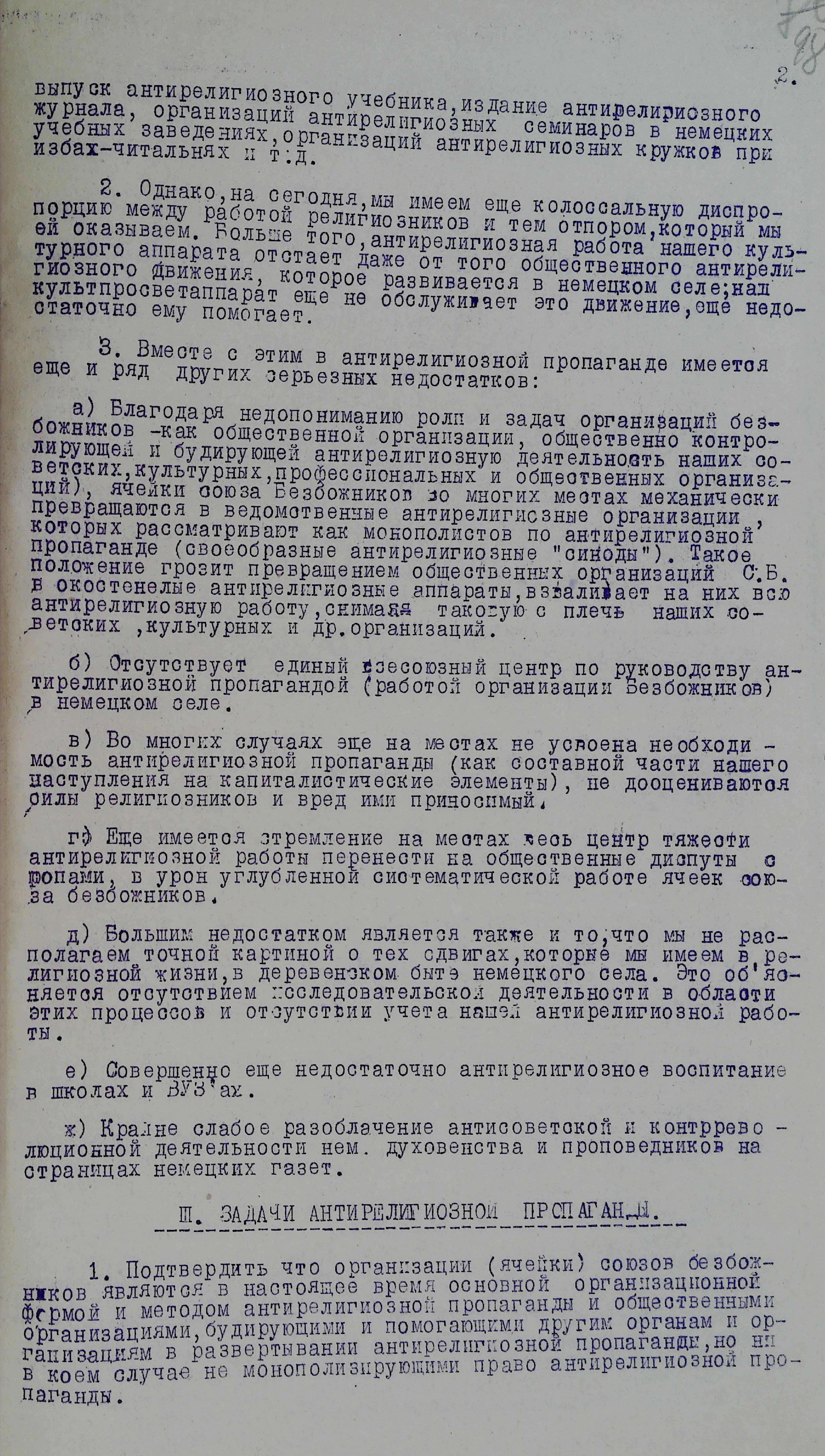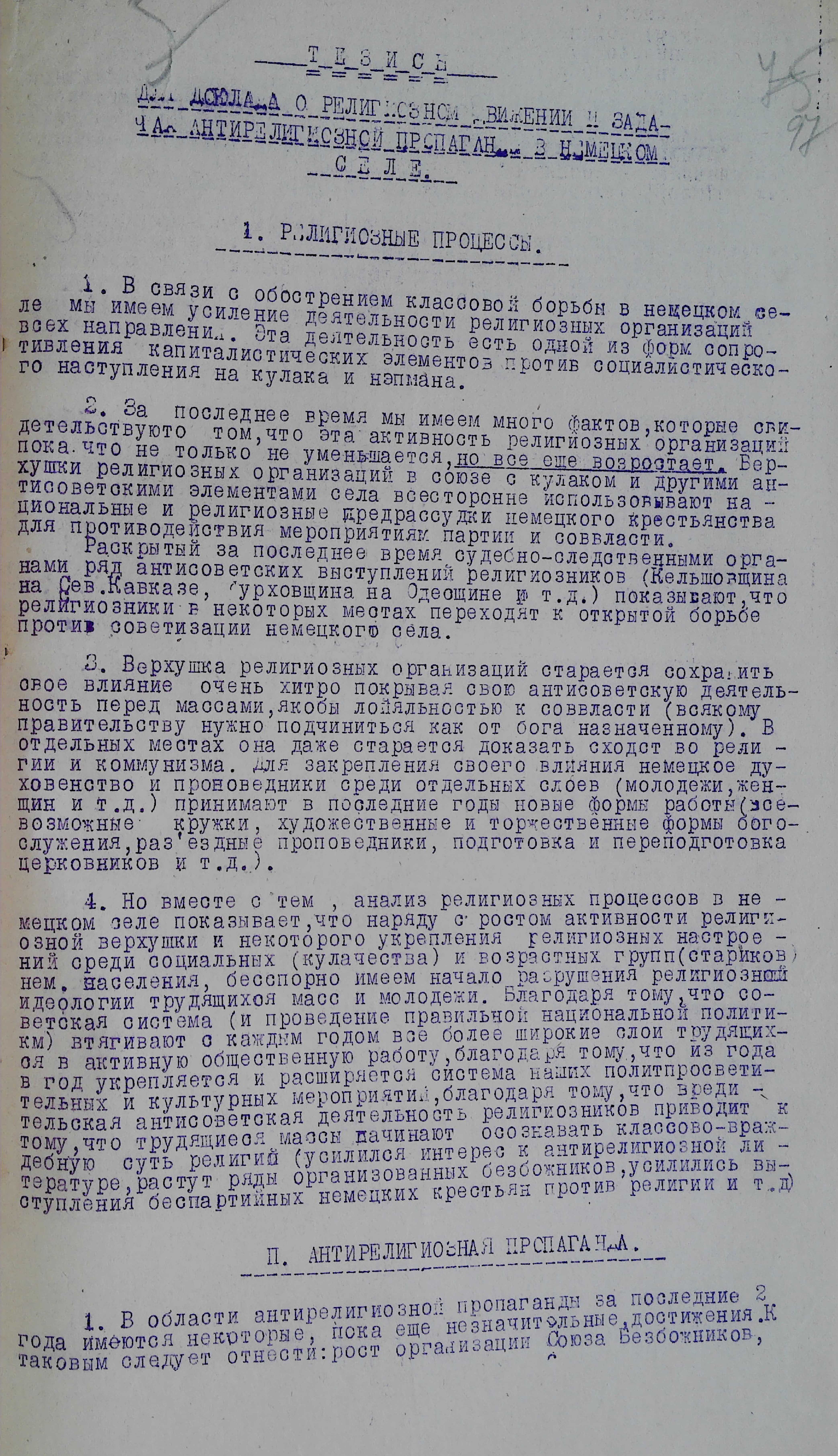 Тезисы для доклада о религиозном движении и задачах антирелигиозной пропаганды в немецком селе.