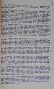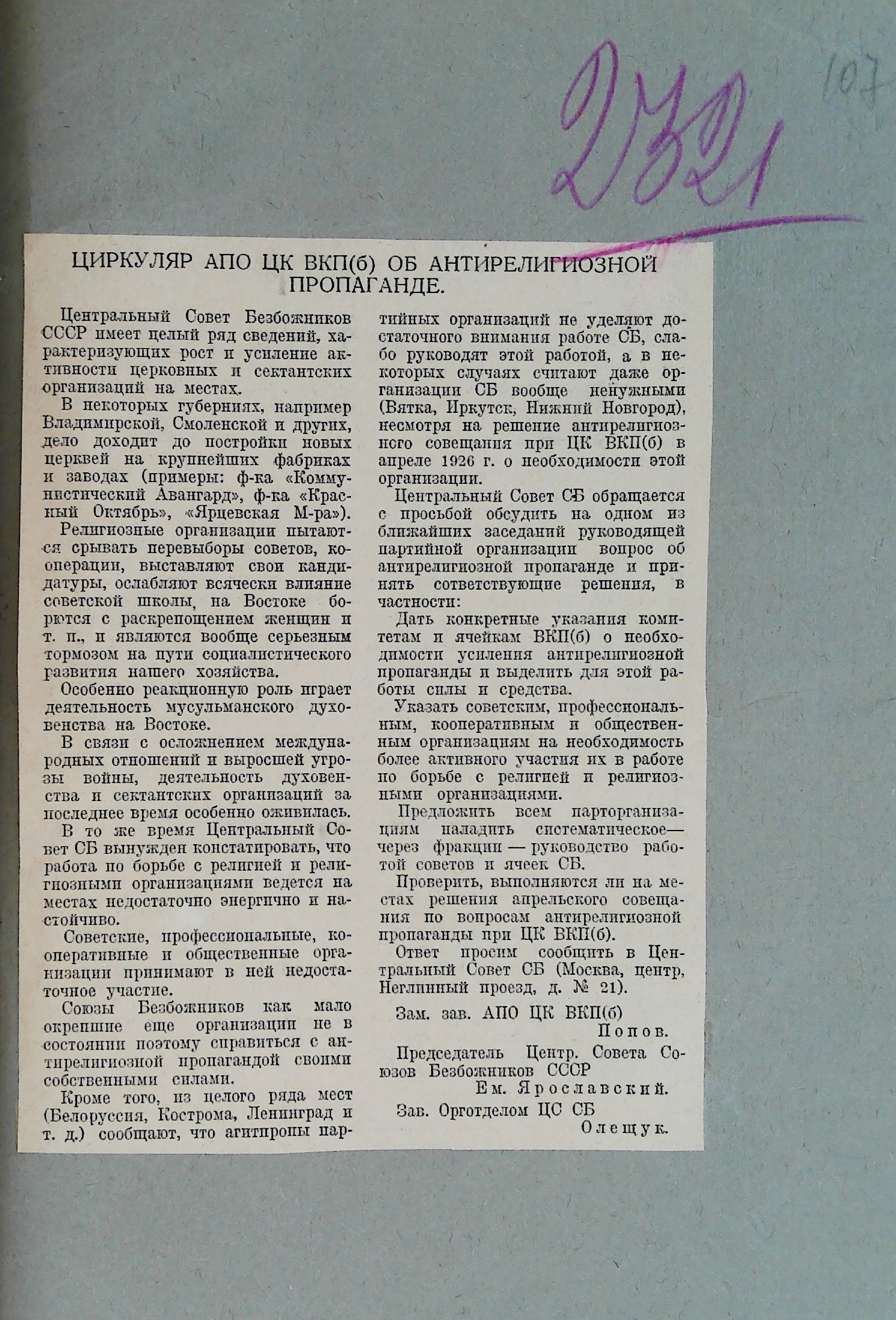 Документ, среди прочего, повествует о роли антирелигиозной литературы и, в частности, о популярной в свое время книге председателя Центрального Совета Союза воинствующих безбожников Е.М. Ярославского «Библия для верующих и неверующих».