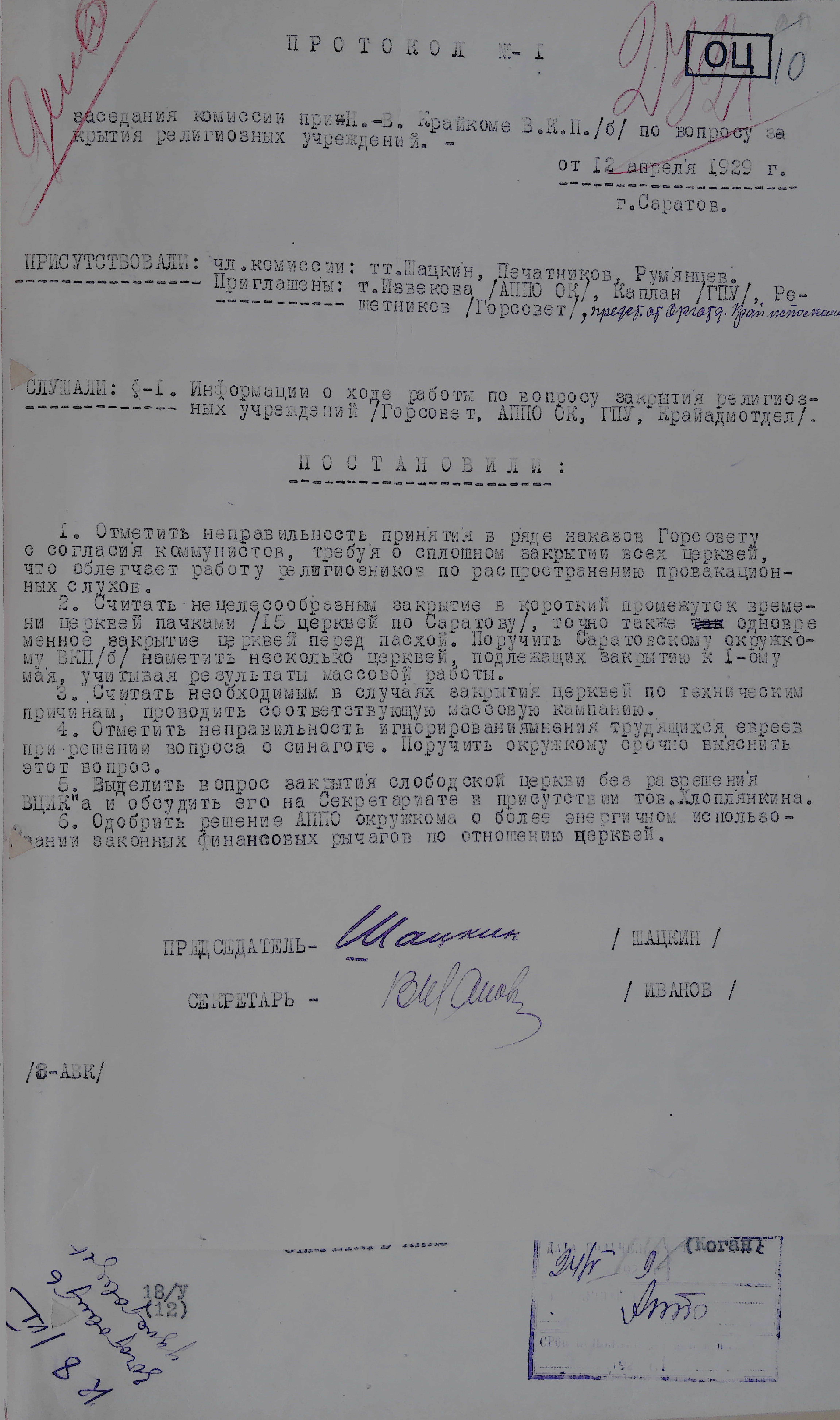 Протокол № 1 заседания комиссии при Нижне-Волжском крайкоме ВКП(б) по вопросу закрытия религиозных учреждений.