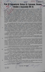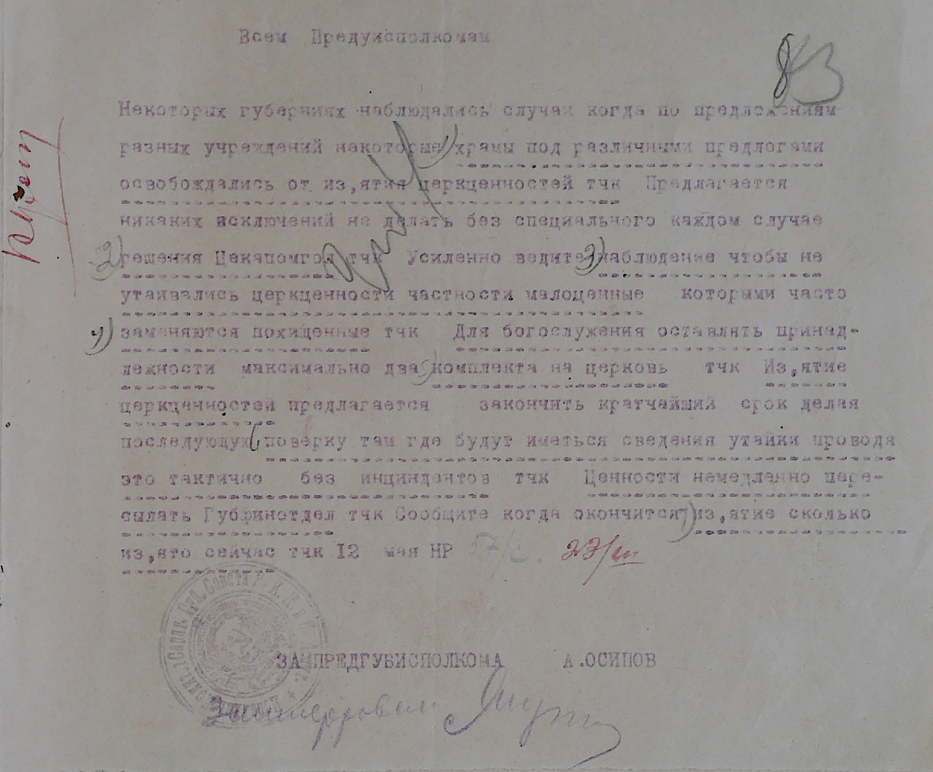 Директива заместителя председателя губернского исполнительного комитета А. Осипова всем председателям уездных исполнительных комитетов о максимально широком изъятии церковных ценностей.