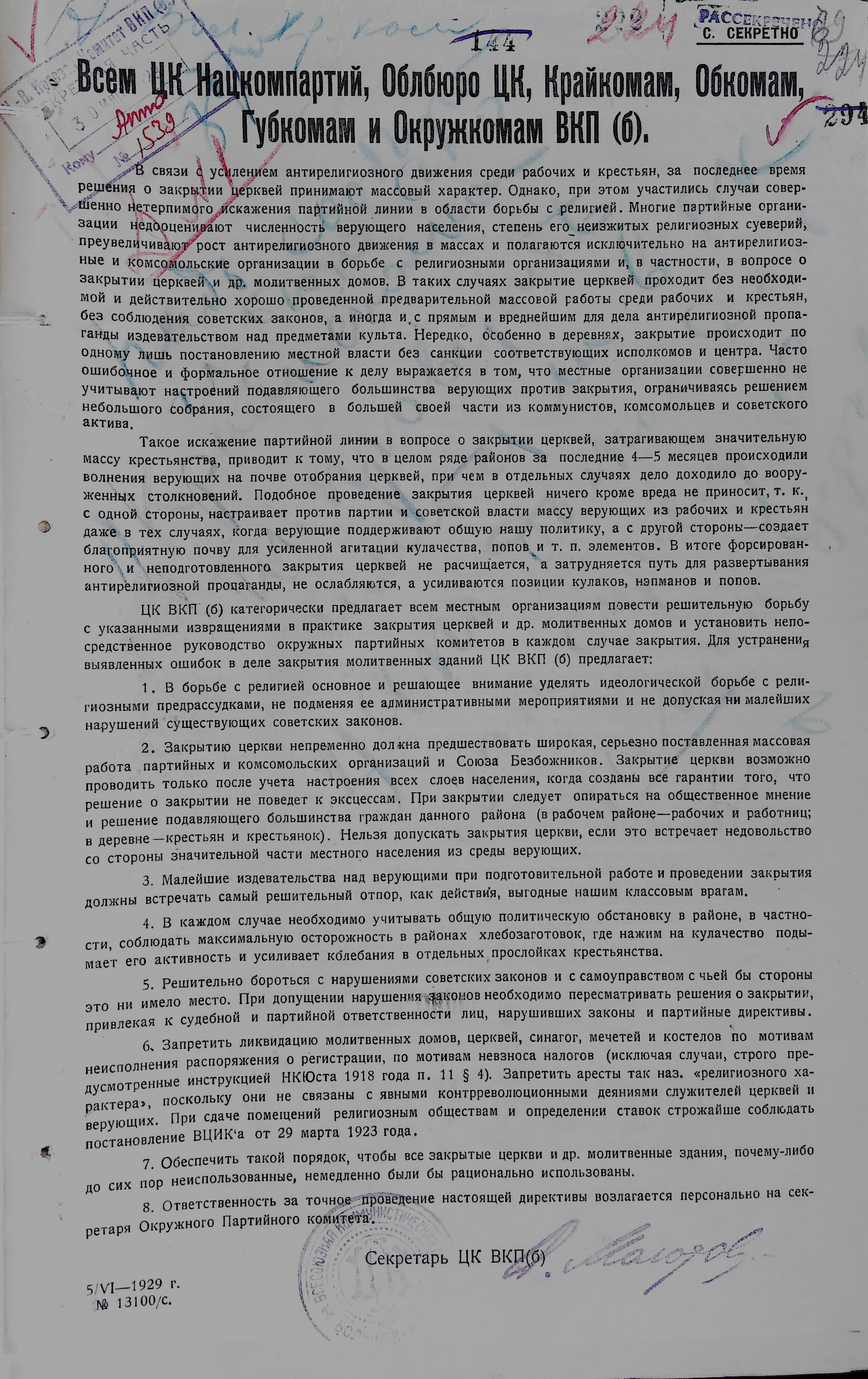 Директива секретаря ЦК ВКП(б) В.М. Молотова всем руководящим партийным комитетам о недопущении перегибов в борьбе с религией, необходимости соблюдения советского законодательства и учета интересов верующих.