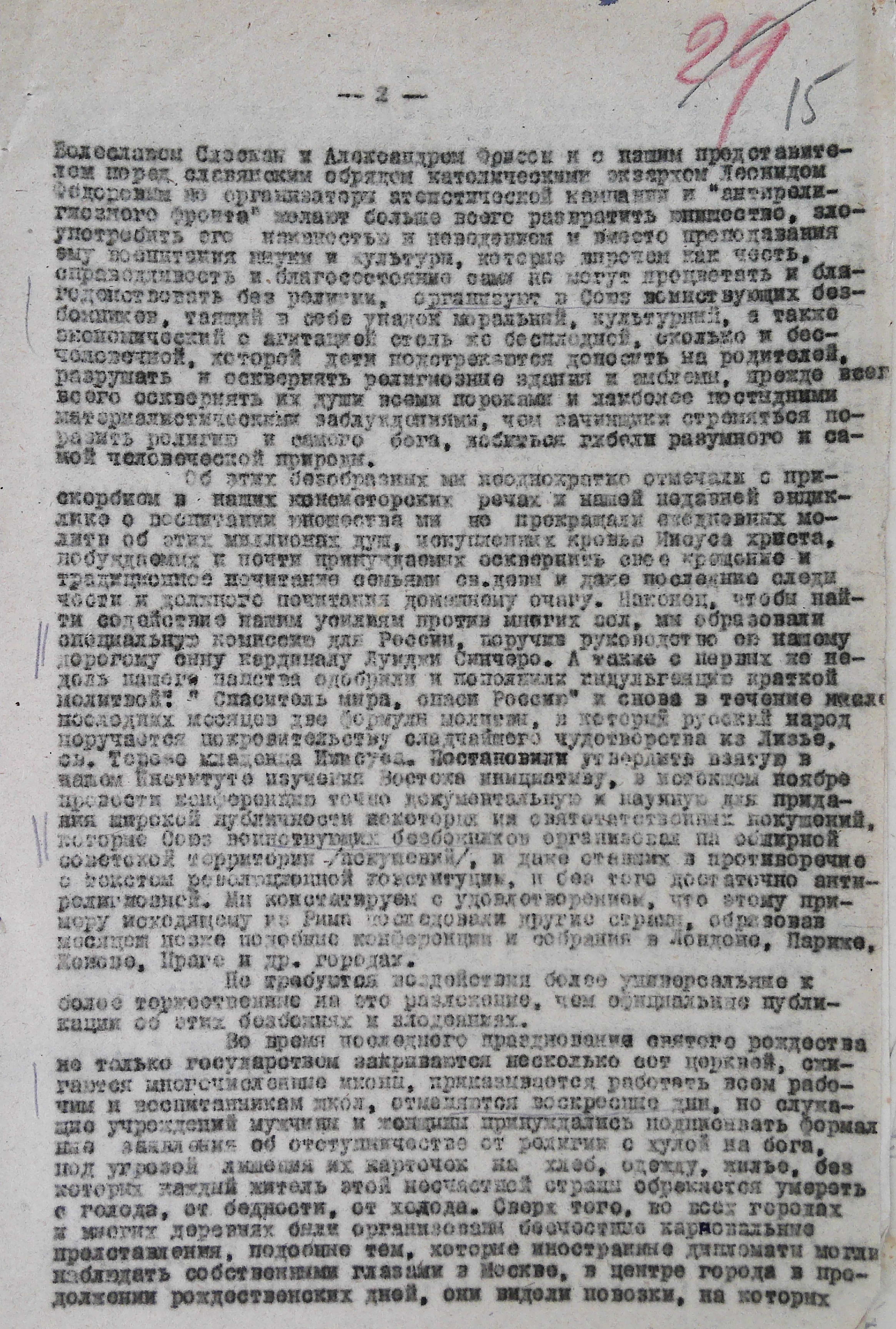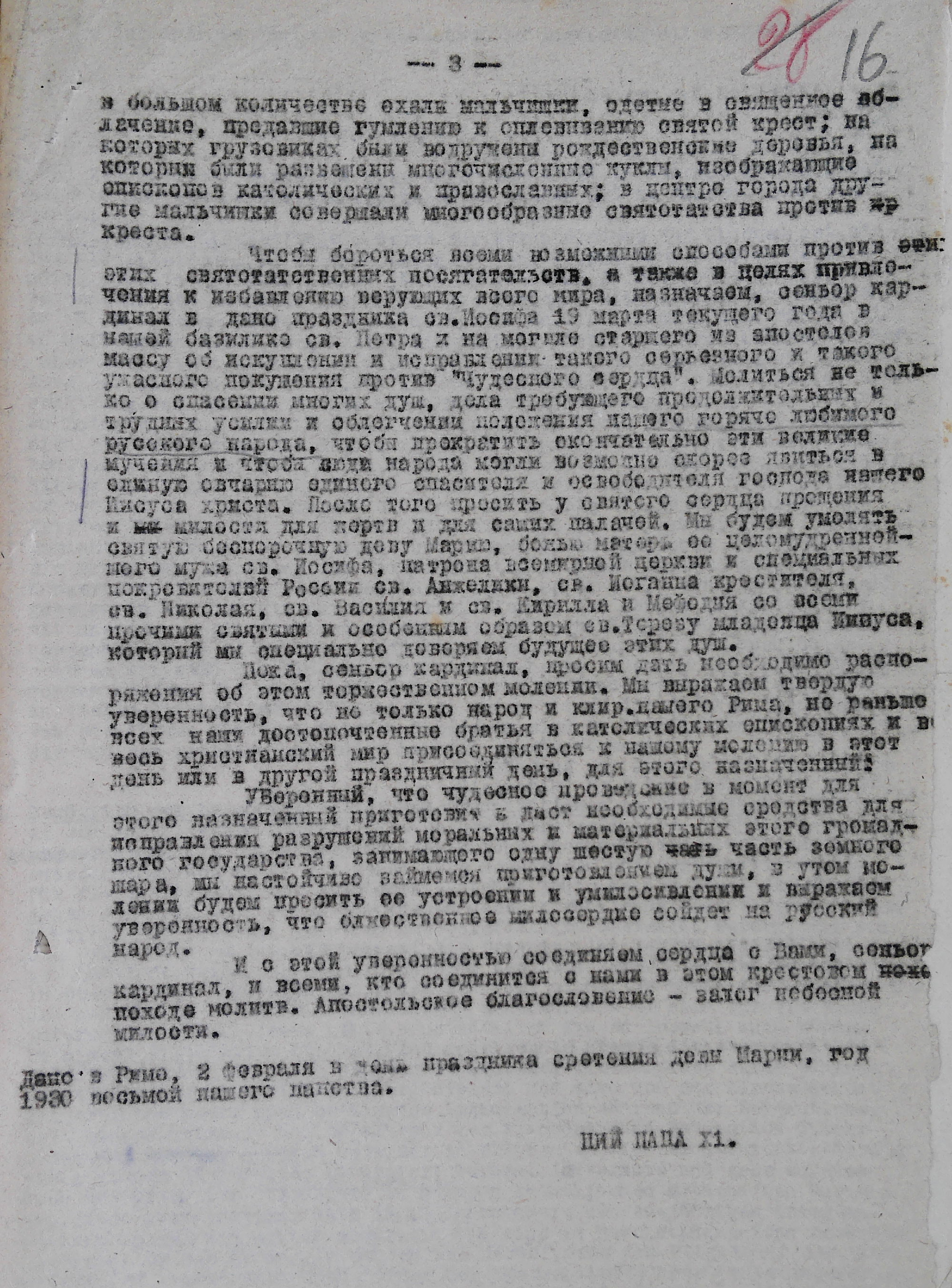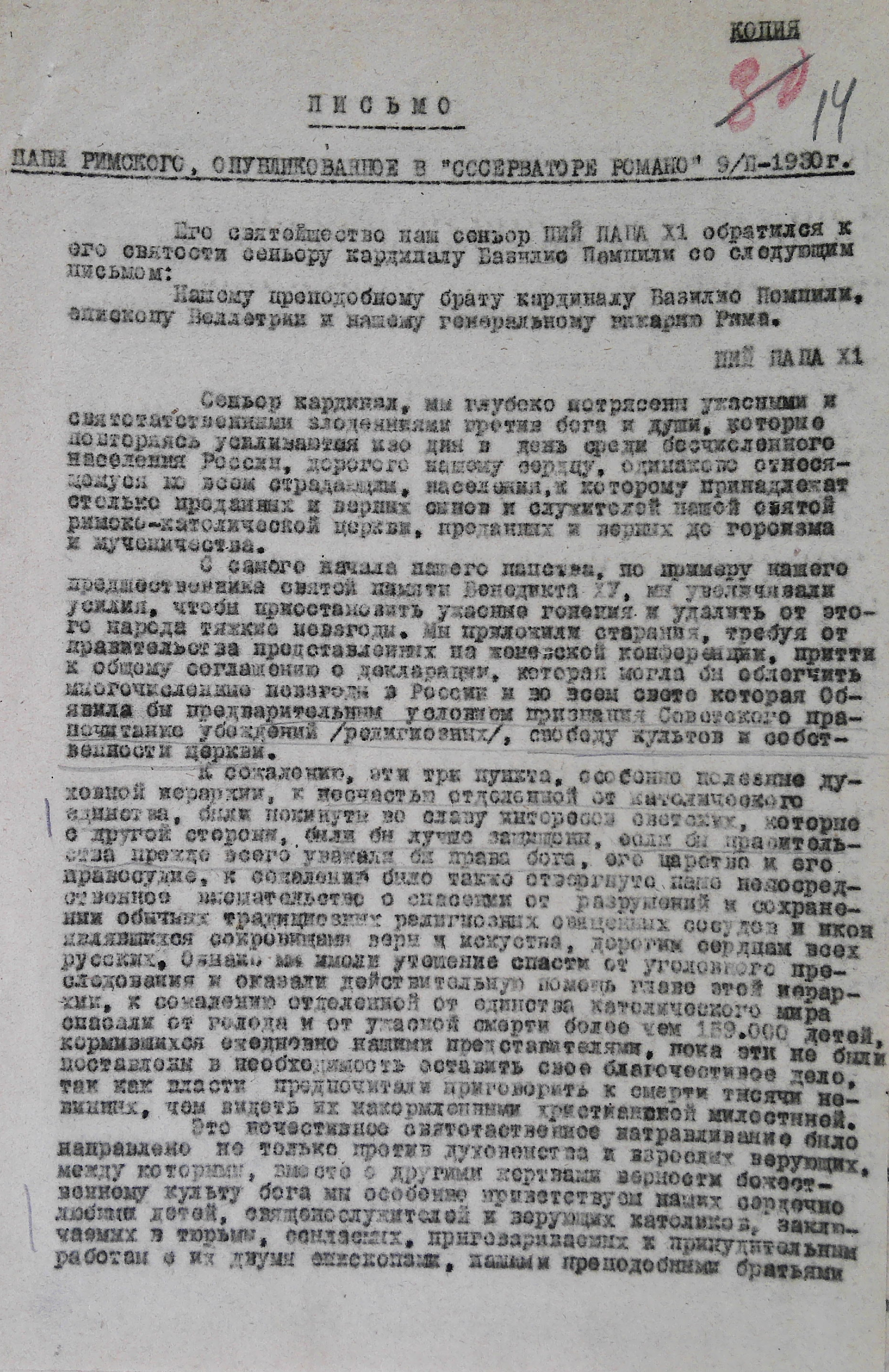 Копия письма Папы Римского Пия XI кардиналу Базилио Помпили о происходящих в СССР репрессиях в отношении верующих и религии.