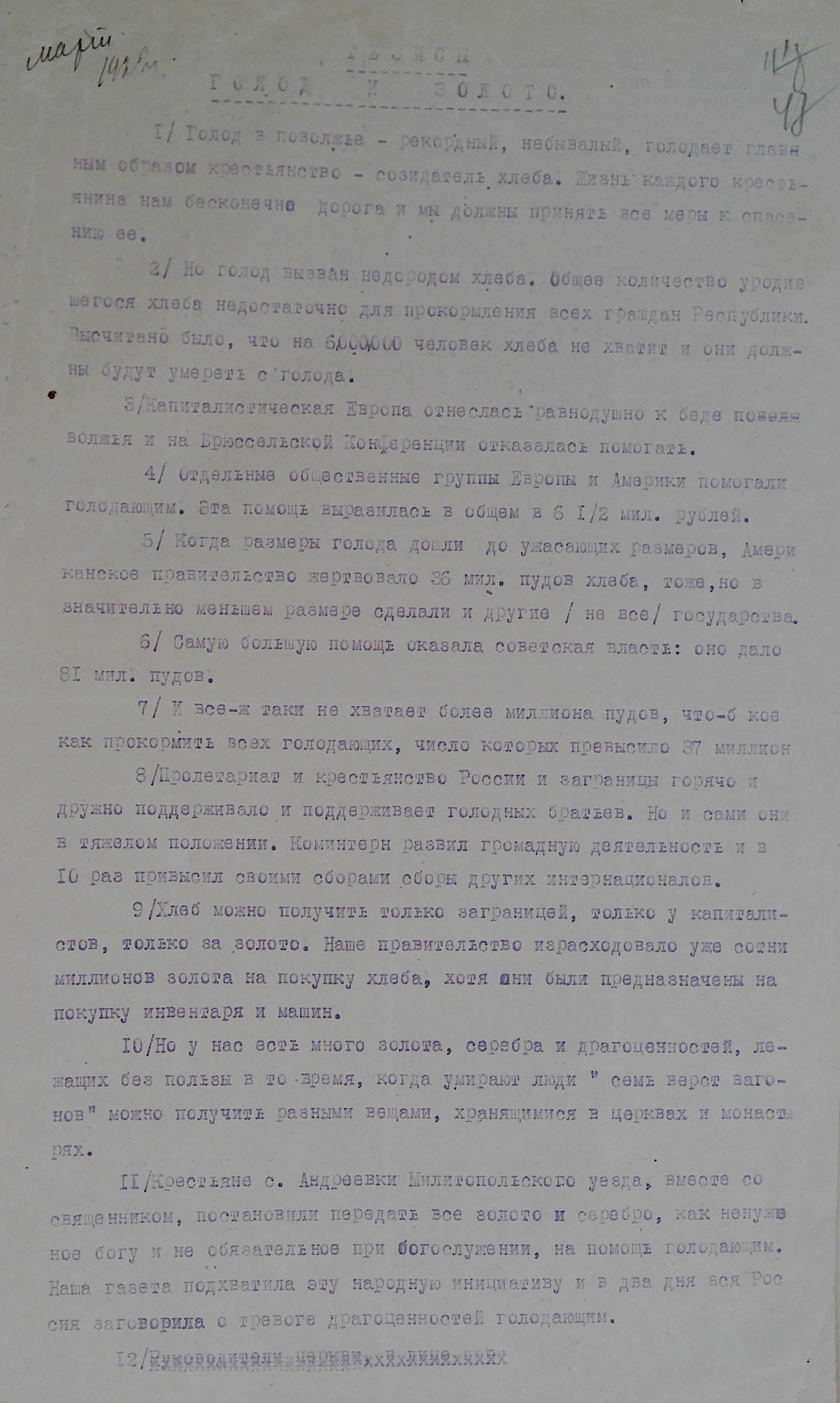 Документ содержит агитационную информацию по вопросу продажи церковных ценностей в связи с голодом в Поволжье.