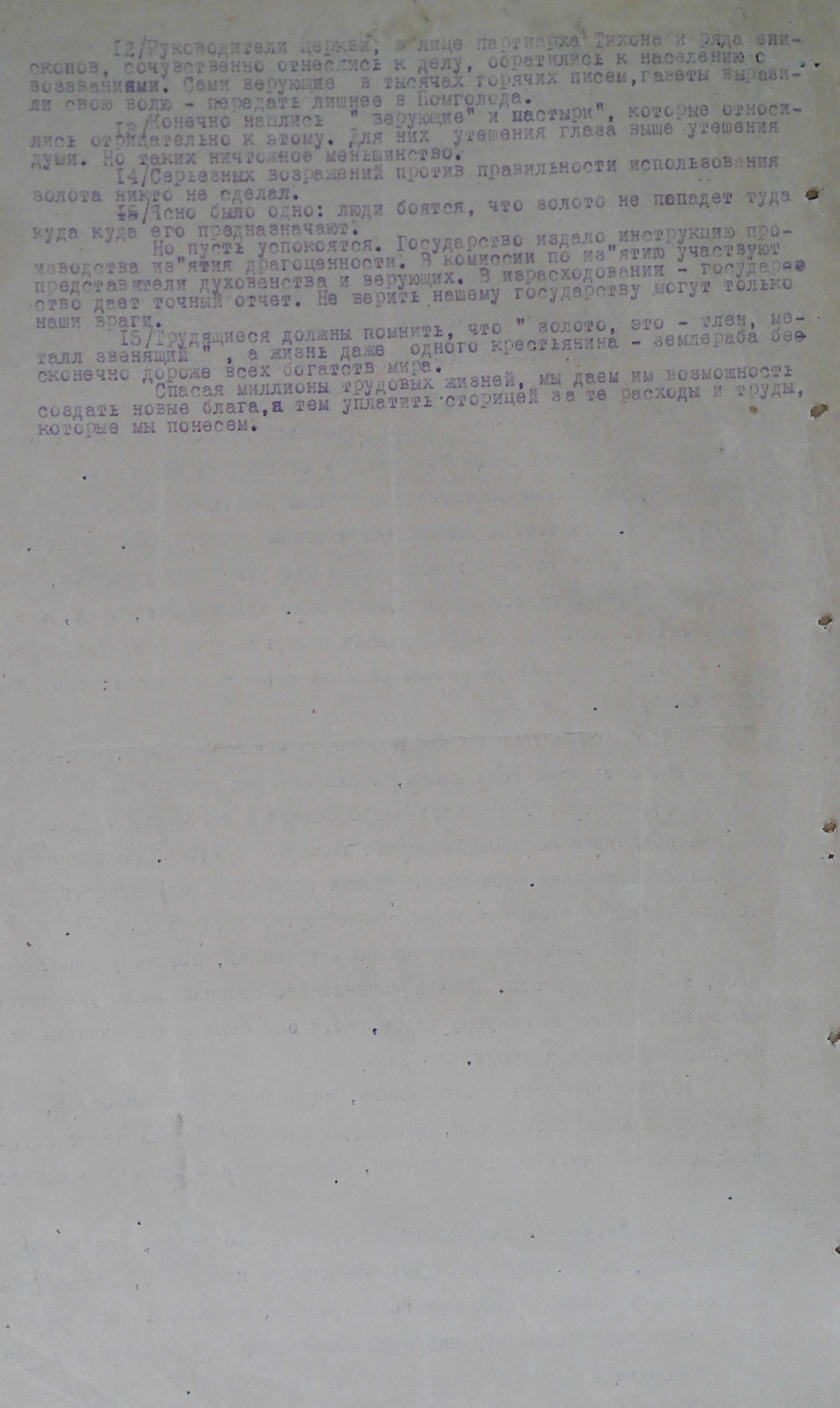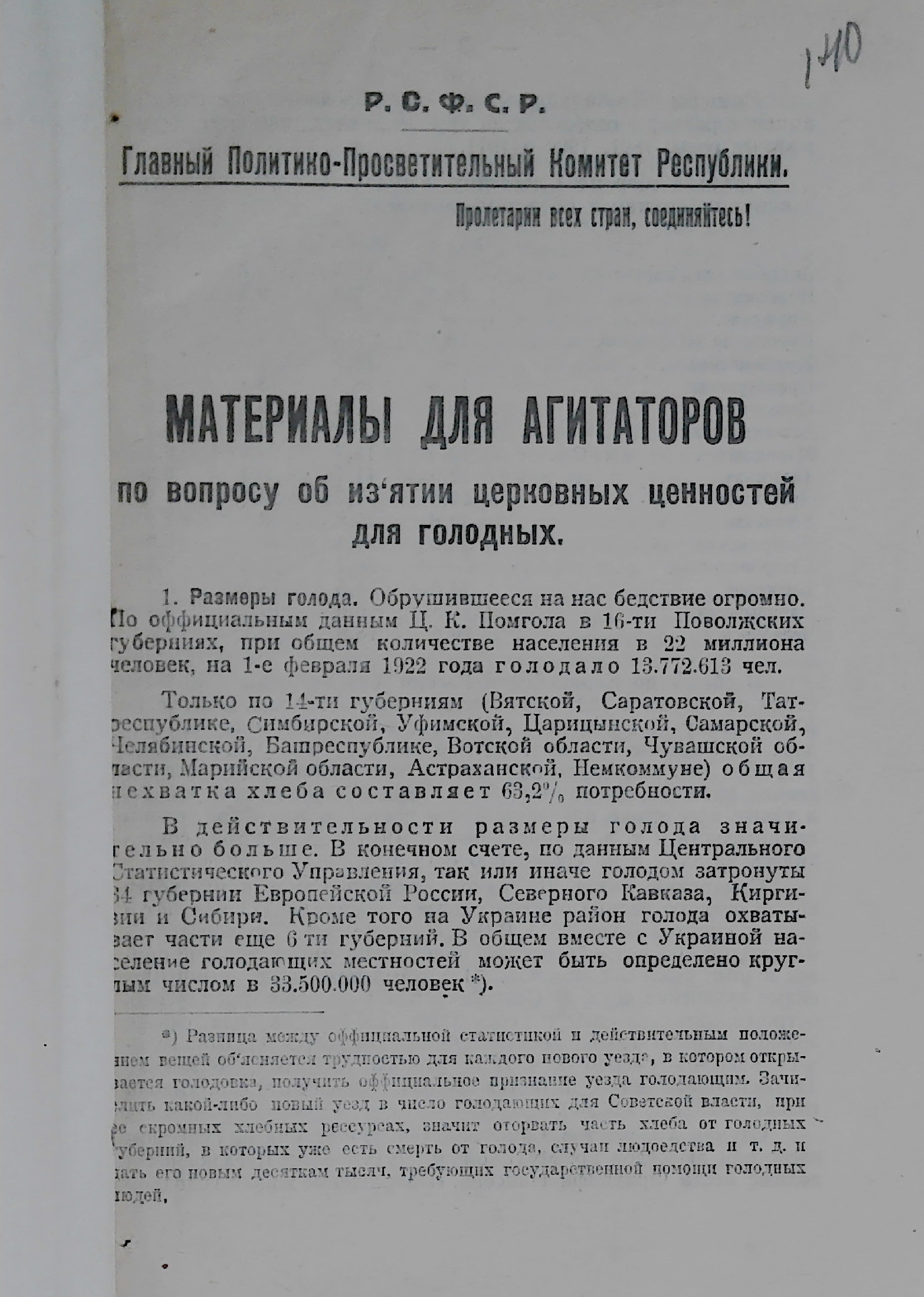 «Материалы для агитаторов по вопросу об изъятии церковных ценностей для голодных».